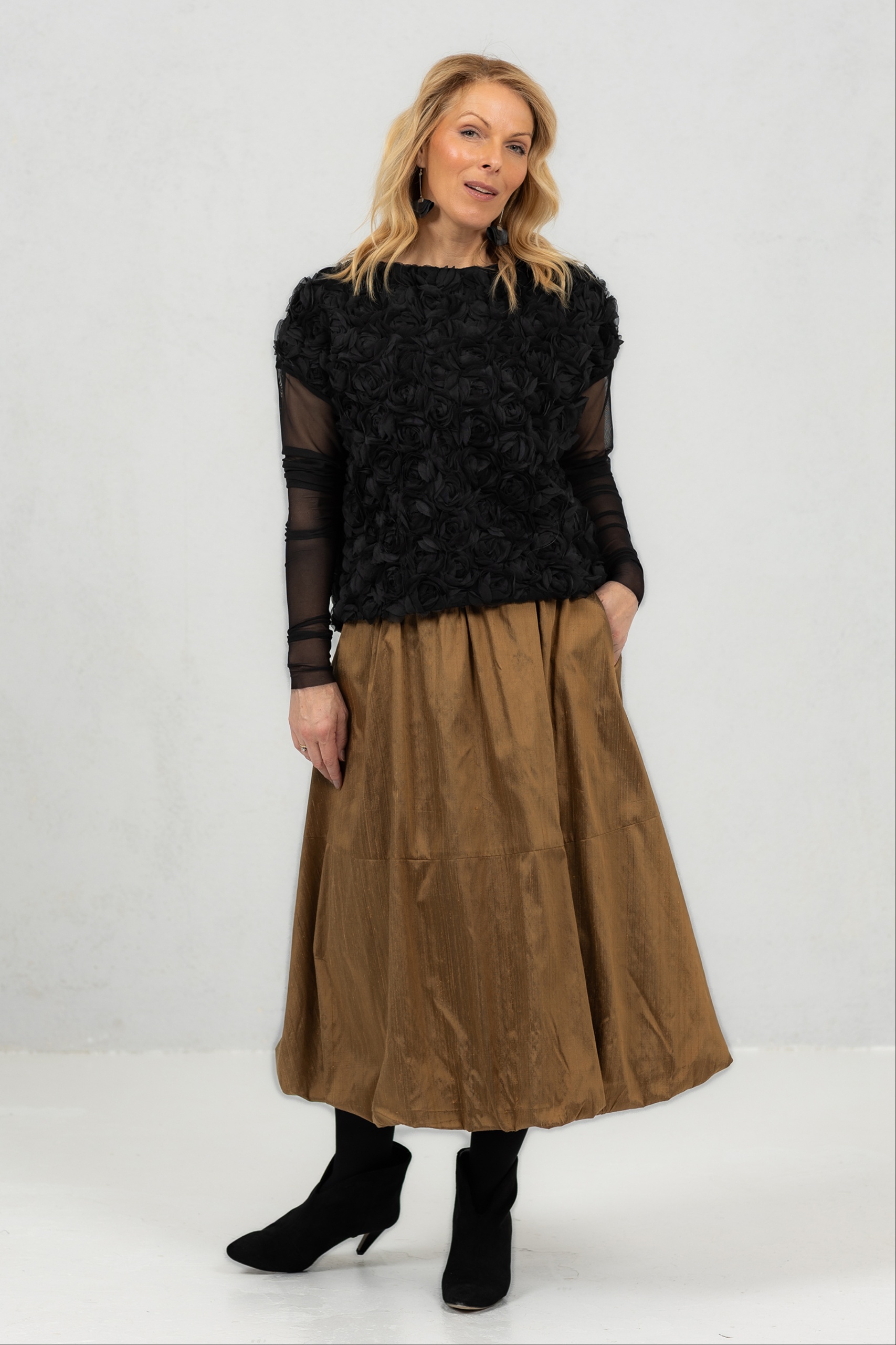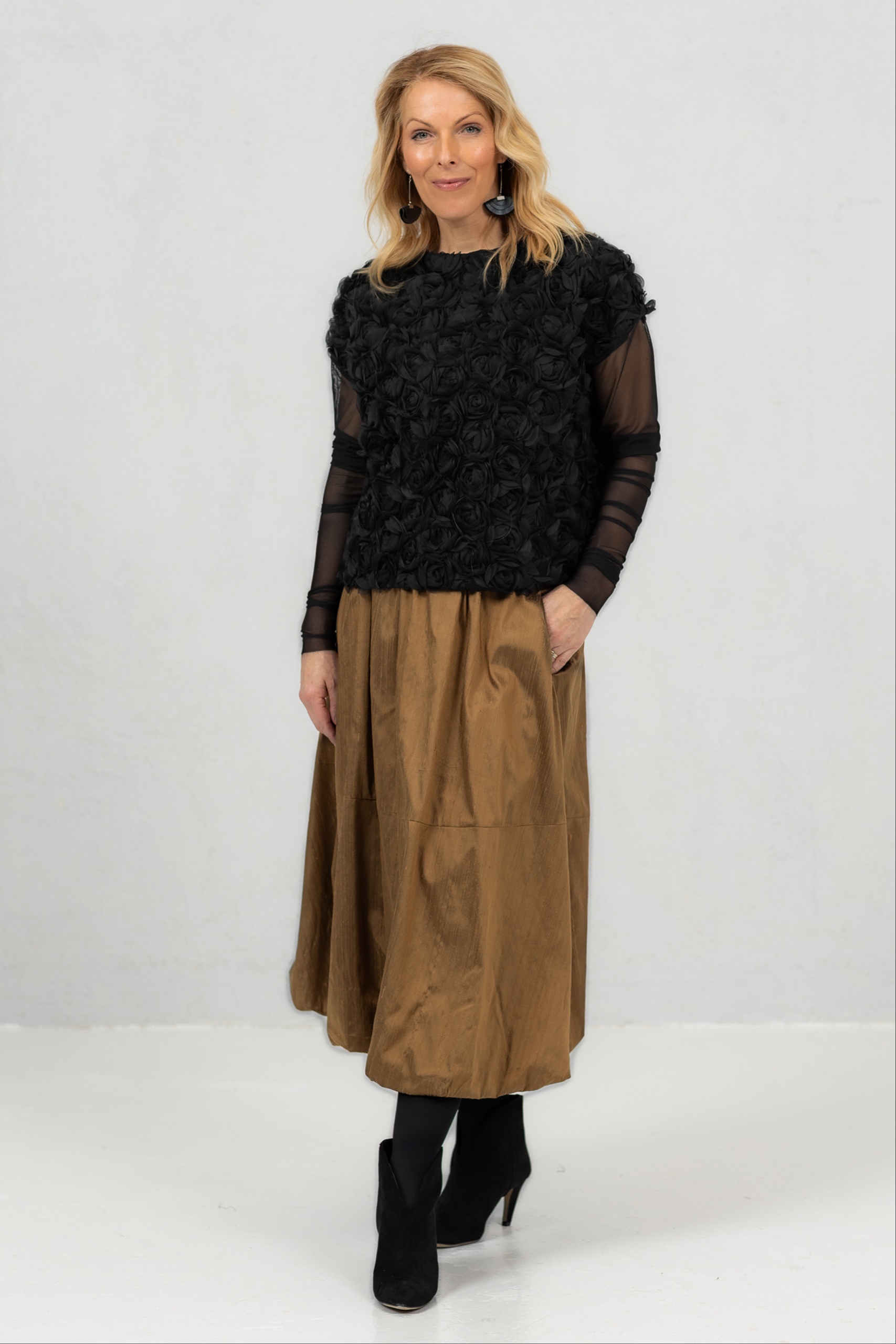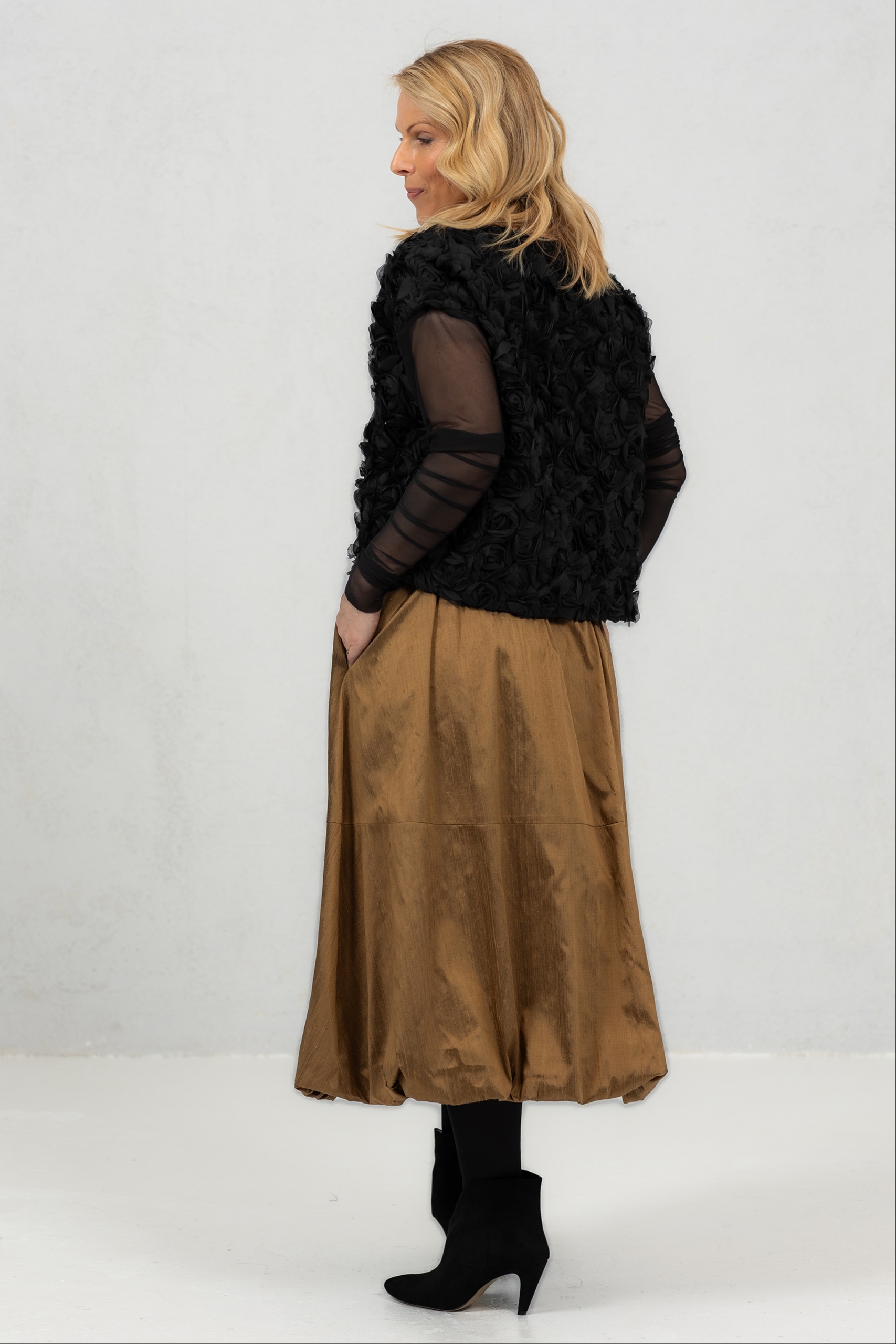 See balloonlõikeline seelik toob igasse sammu õhulisust ja mängulisust. Siidist kangas lisab pidulikkust, samas kui lõige lisab liikumisvabadust ja mugavust. Seeliku alläär on kergelt kokkutõmmatud, mis loob iseloomuliku balloonefekti. Mugavust lisab ka vööosas olev pehme kummivärvel, mistõttu istub seelik hästi erinevate figuuridega.