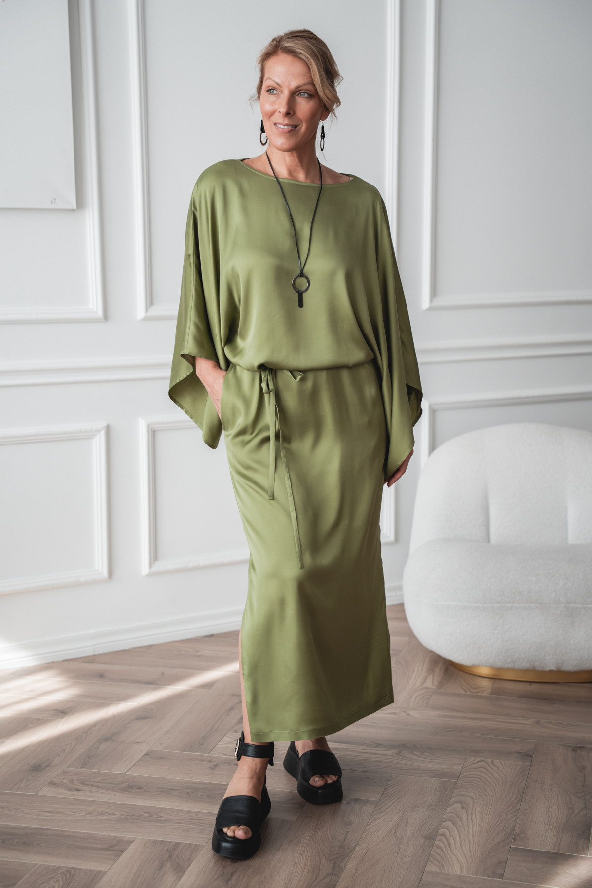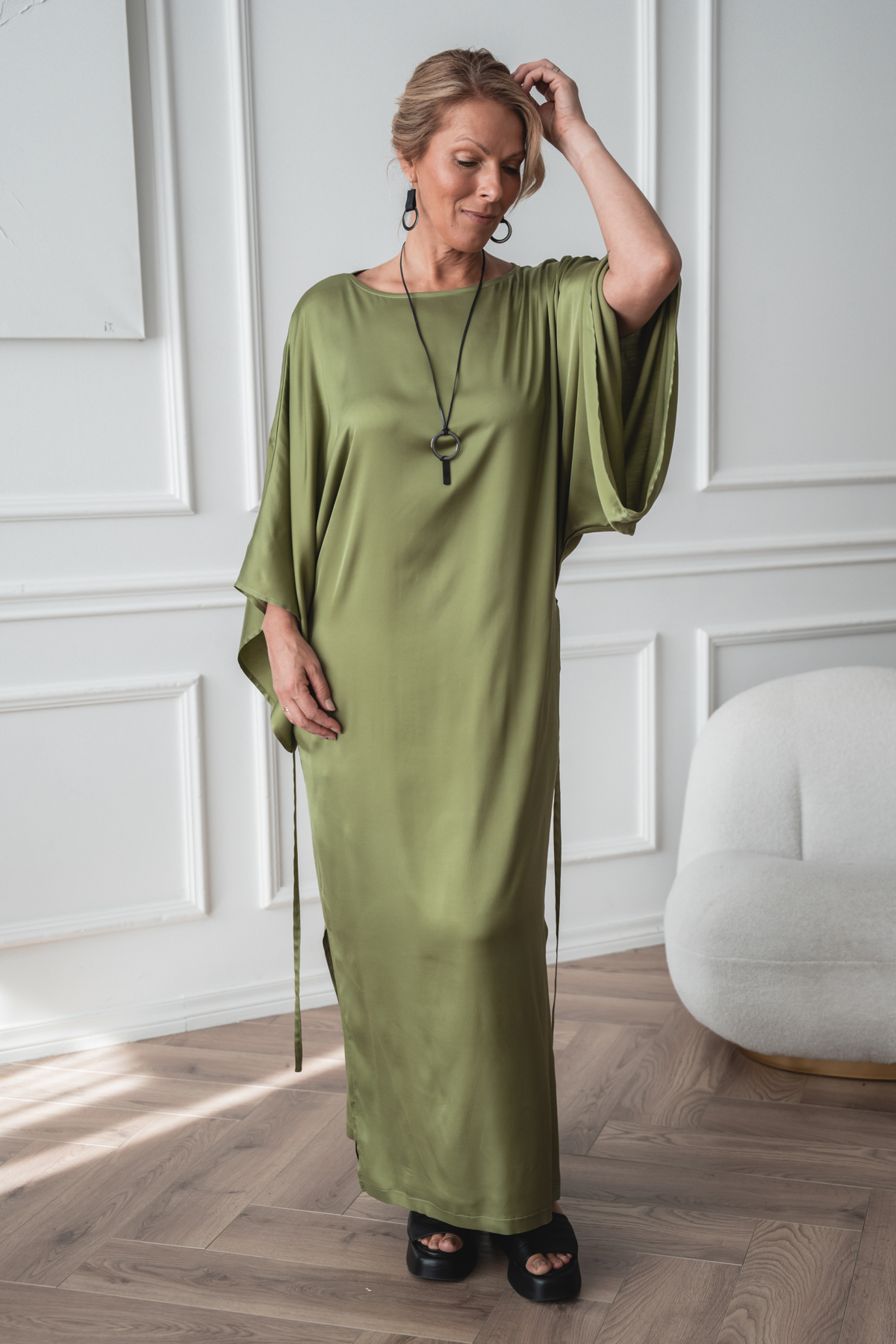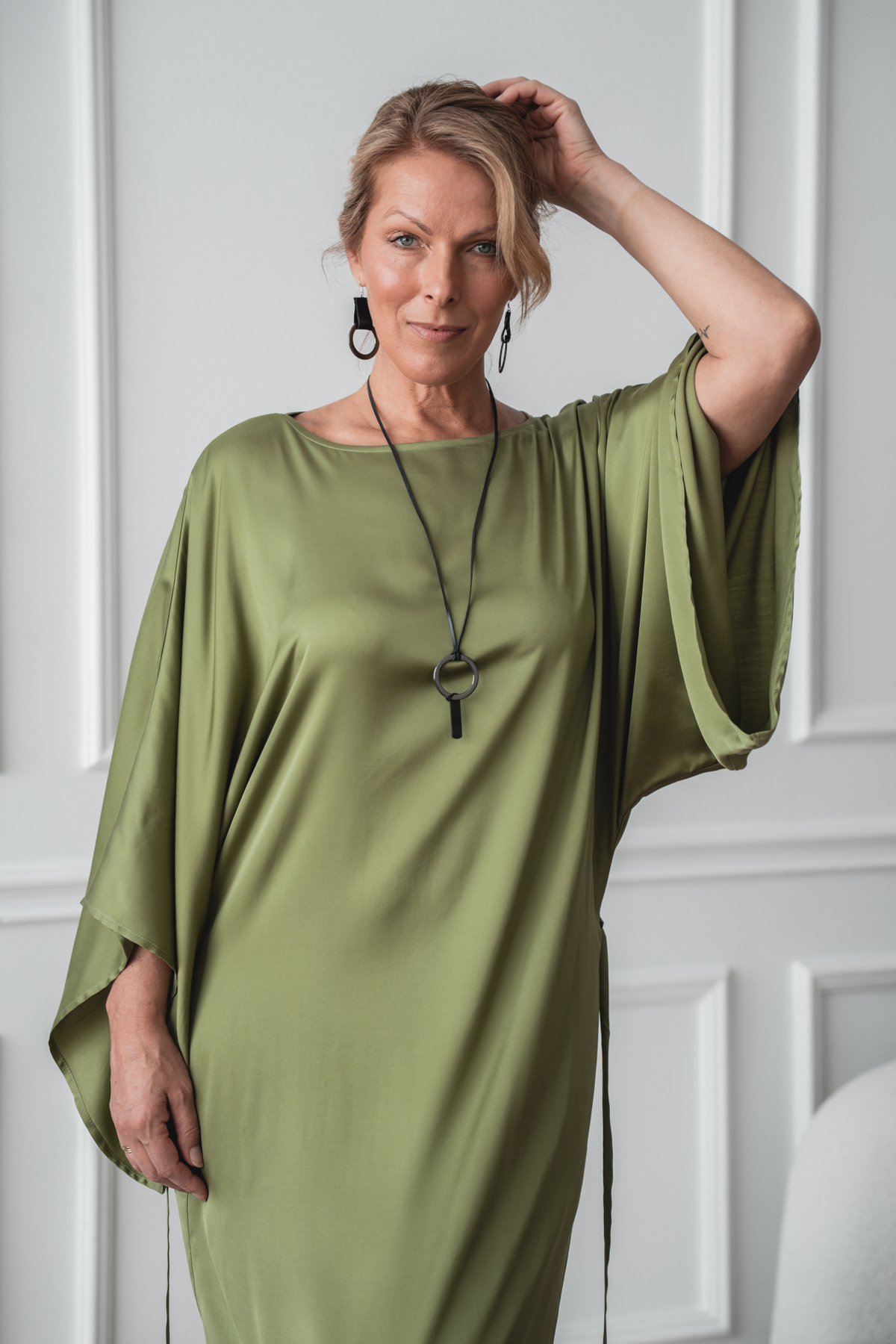 See kangas ühendab pehmuse, elastsuse ja kauni langevuse. Viskoos ja rayon annavad materjalile siidise puudutuse ning hingavuse, muutes selle nahal eriti mõnusaks. Tänu elastaanile on kangas kergelt veniv, pakkudes mugavat liikumisvabadust ja paremat istuvust. Materjal langeb sujuvalt ning loob elegantse ja voolava silueti. Ideaalne valik, kui otsid mugavat, pehmet ja hästi istuvat rõivast igapäevaseks kandmiseks.