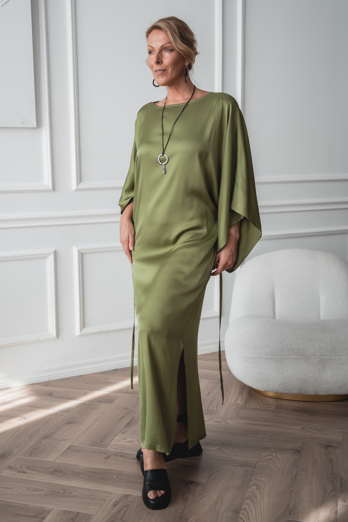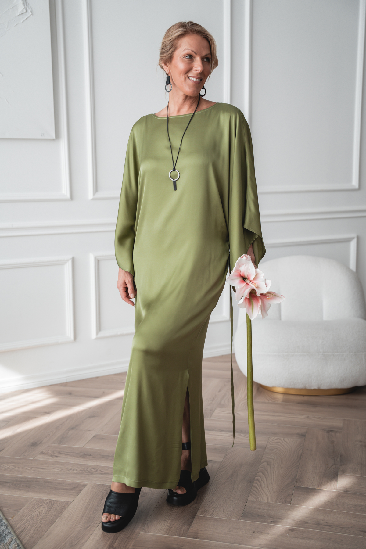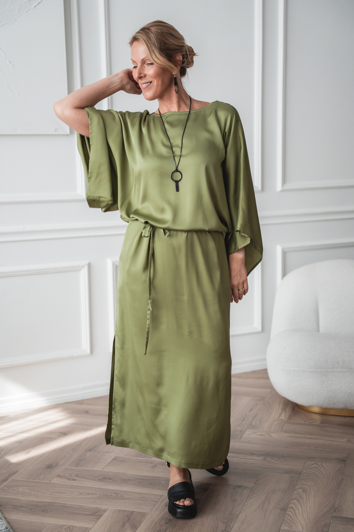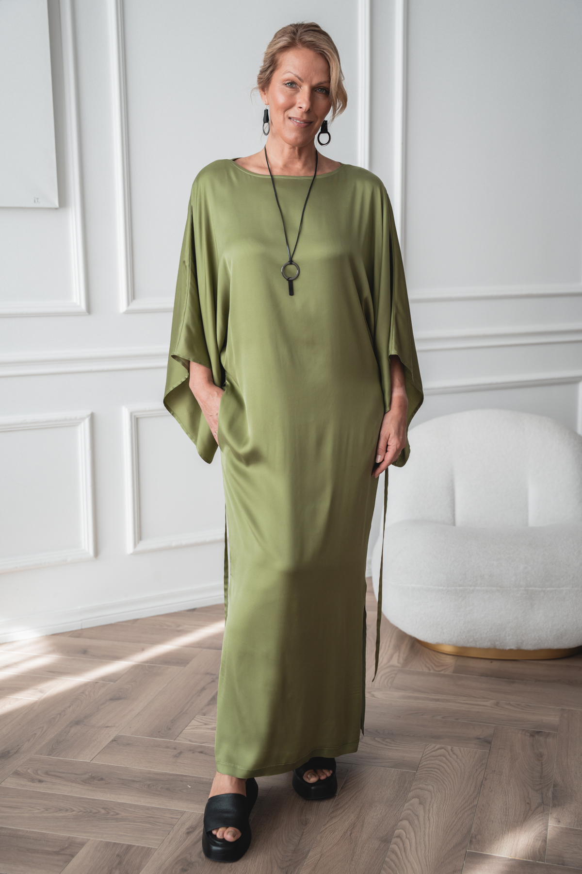 See kangas ühendab pehmuse, elastsuse ja kauni langevuse. Viskoos ja rayon annavad materjalile siidise puudutuse ning hingavuse, muutes selle nahal eriti mõnusaks. Tänu elastaanile on kangas kergelt veniv, pakkudes mugavat liikumisvabadust ja paremat istuvust. Materjal langeb sujuvalt ning loob elegantse ja voolava silueti. Ideaalne valik, kui otsid mugavat, pehmet ja hästi istuvat rõivast igapäevaseks kandmiseks.