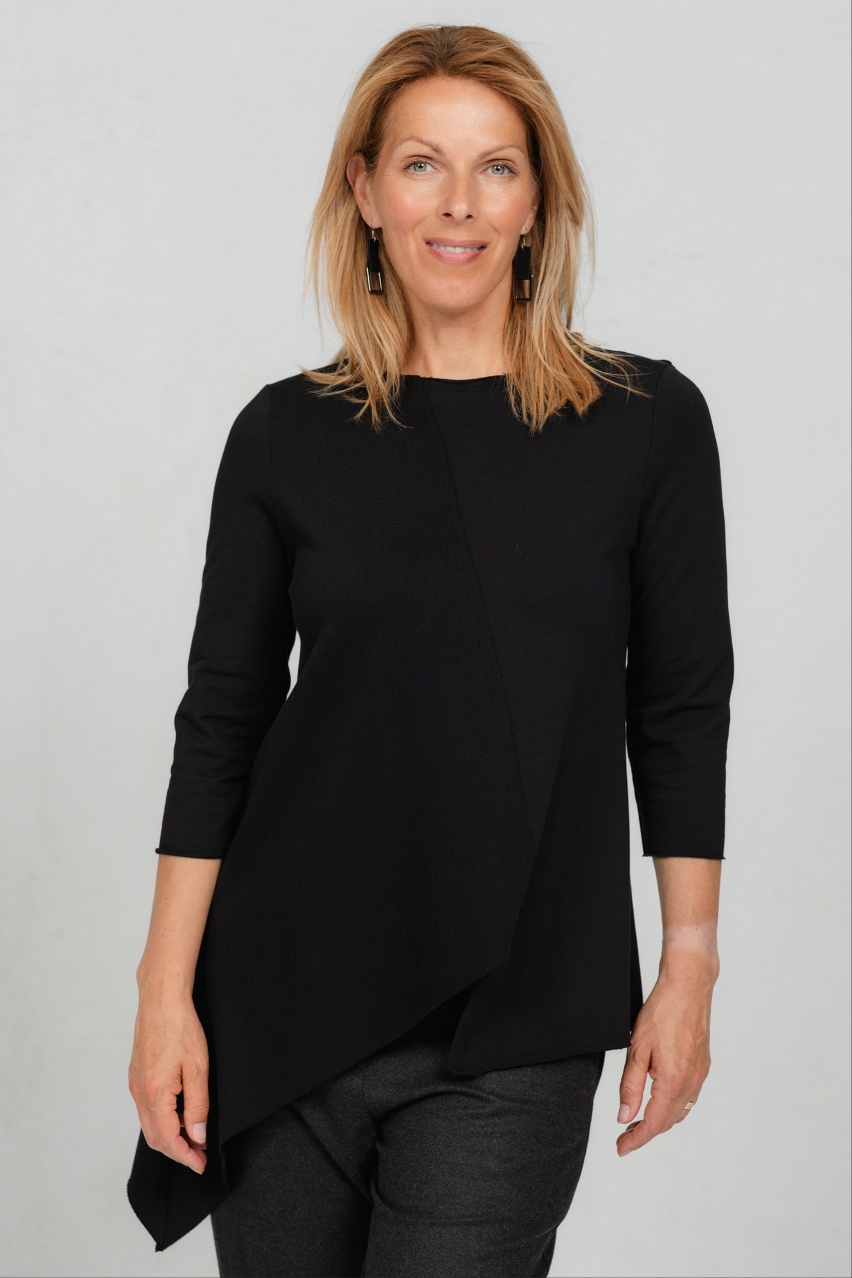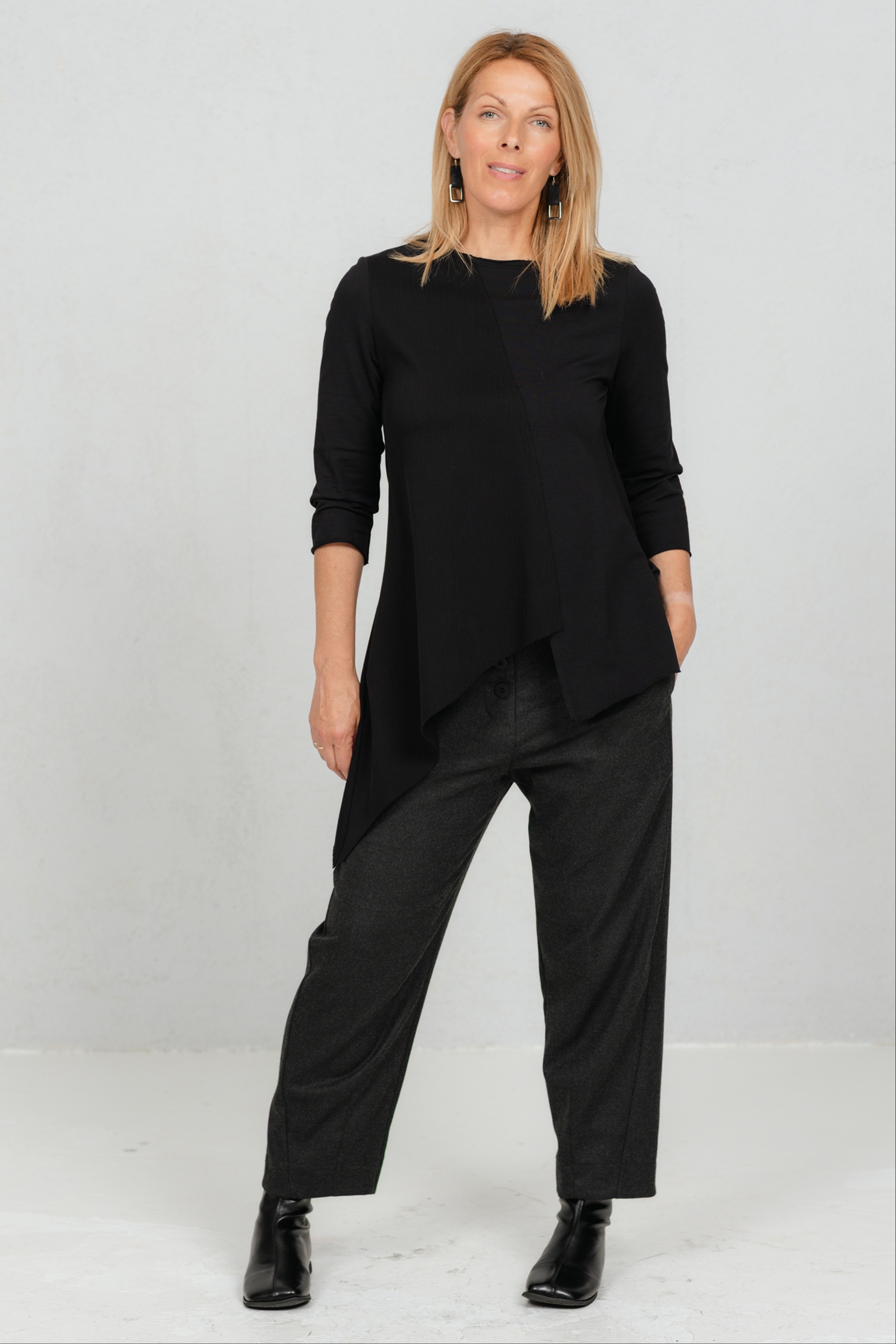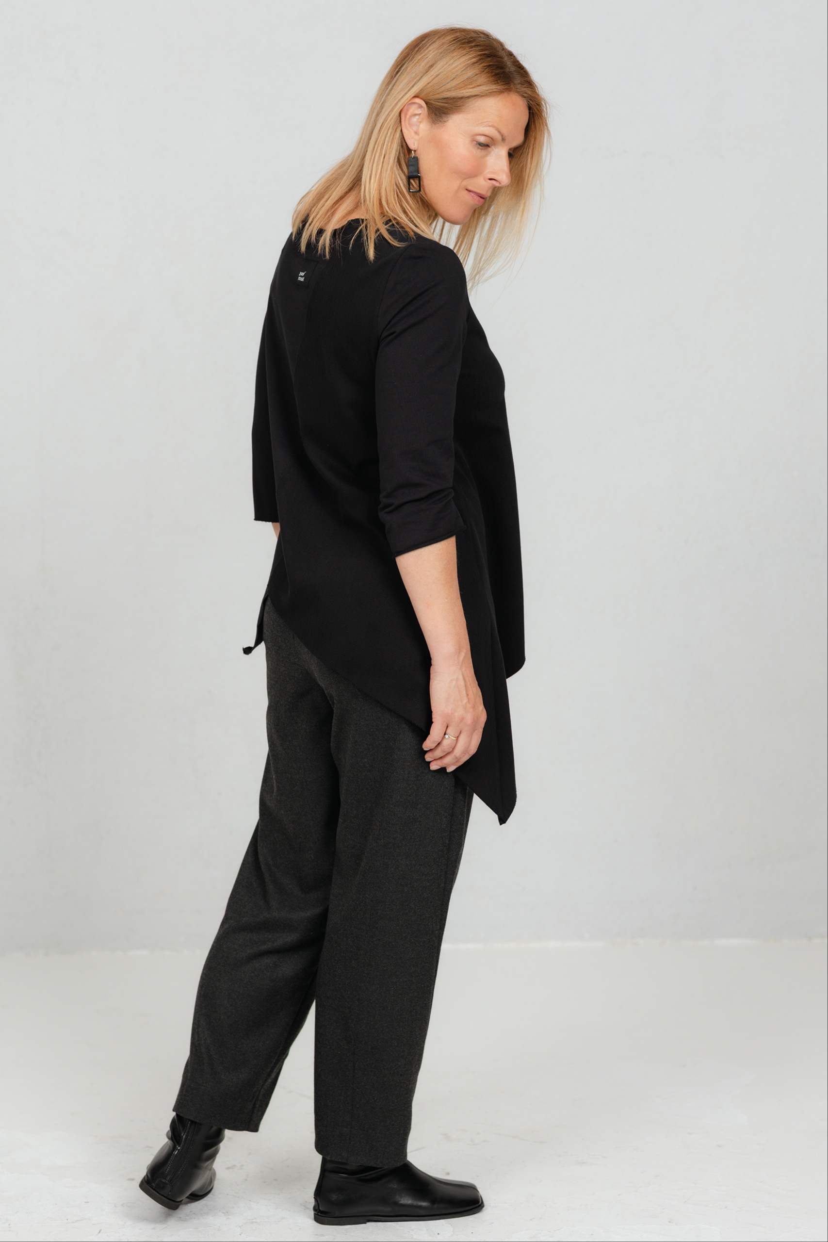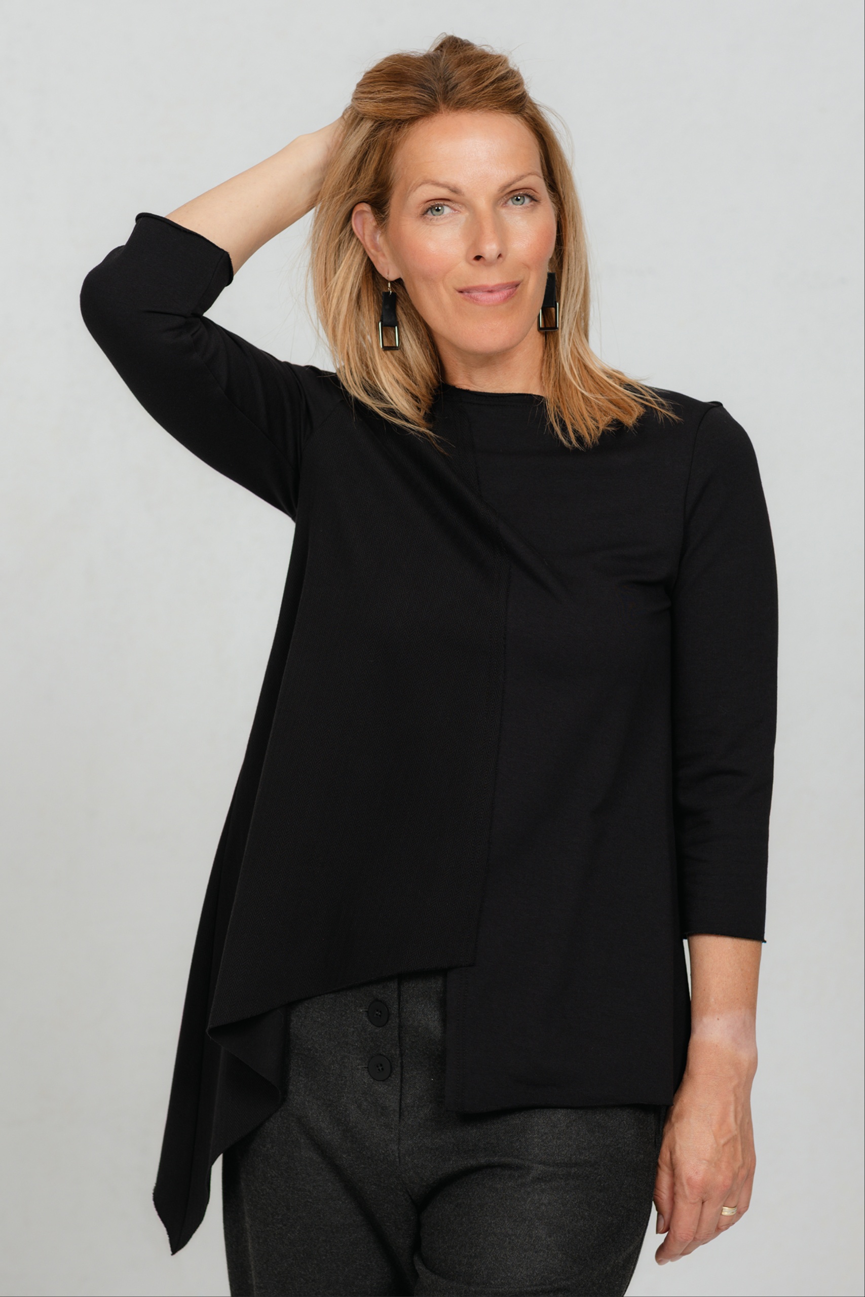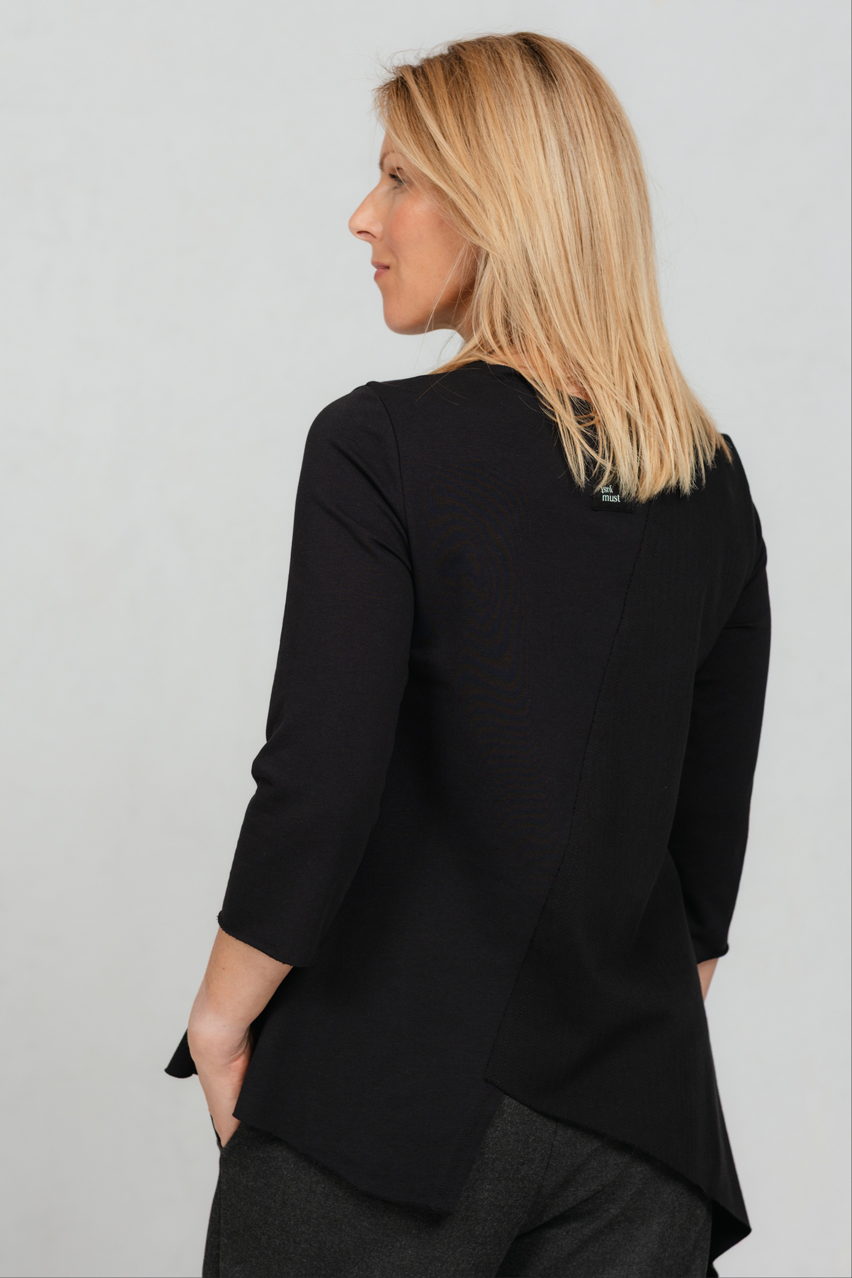 Minimalistlik, kuid omanäoline must pluus, mis ühendab mugavuse ja peene detailimängu. Valmistatud pehmest puuvillasest trikotaažkangast, mille ühel poolel olev efektne kalasaba muster loob huvitava kontrasti. Asümmeetriline alumine äär lisab karakterit, kolmveerandvarrukad ja klassikaline ümar kaelus annavad ajatu lihtsuse. Sobib suurepäraselt igapäevasesse garderoobi ning on lihtsasti kombineeritav kihilistes ja mitmekülgsetes stiilides.