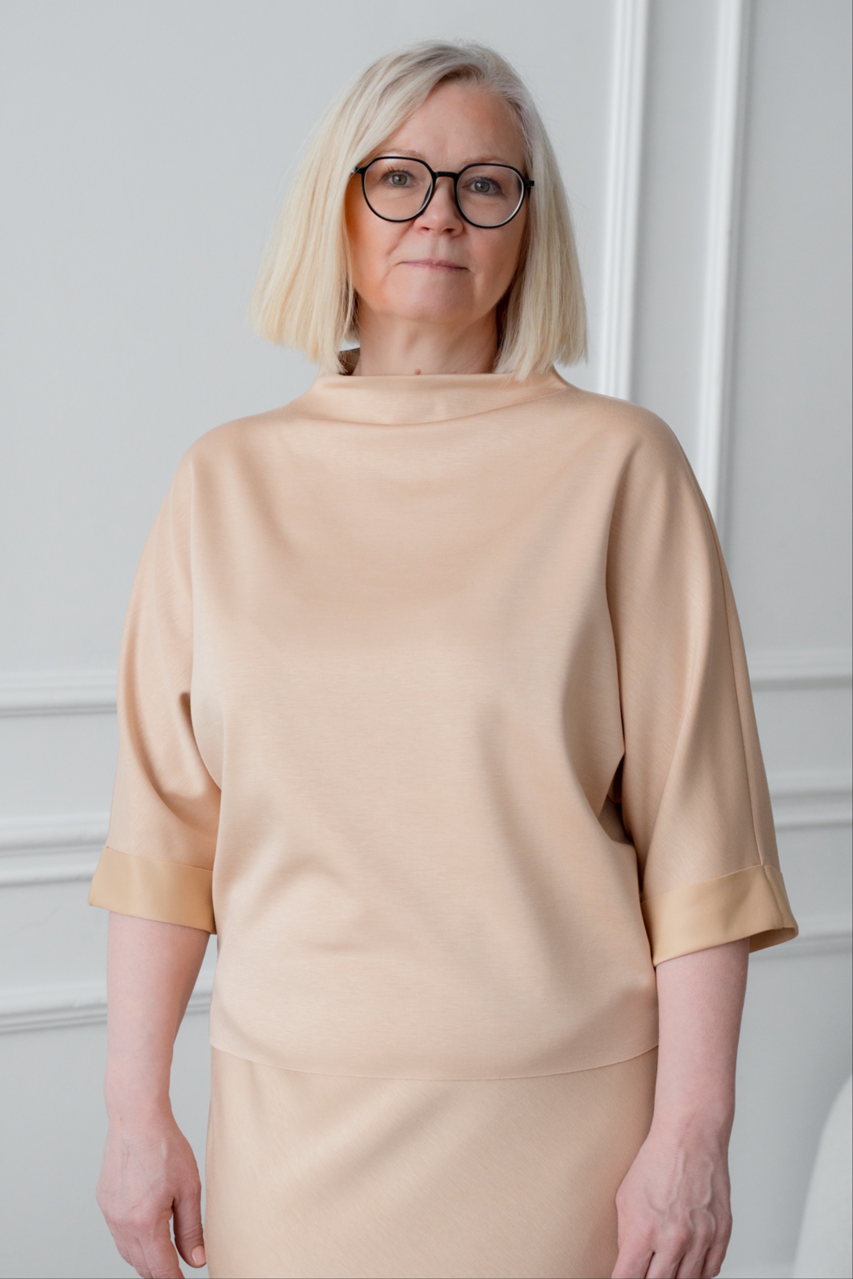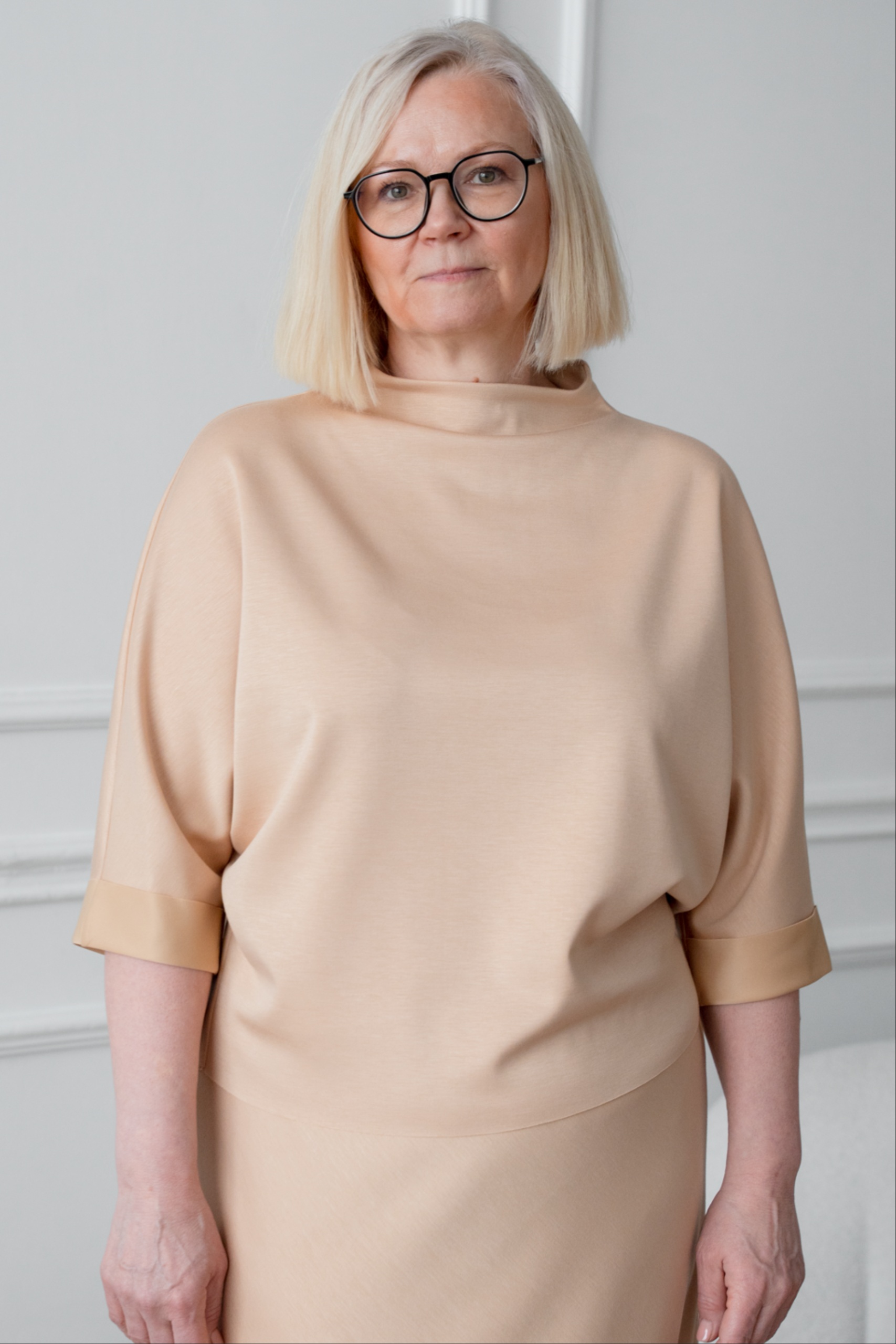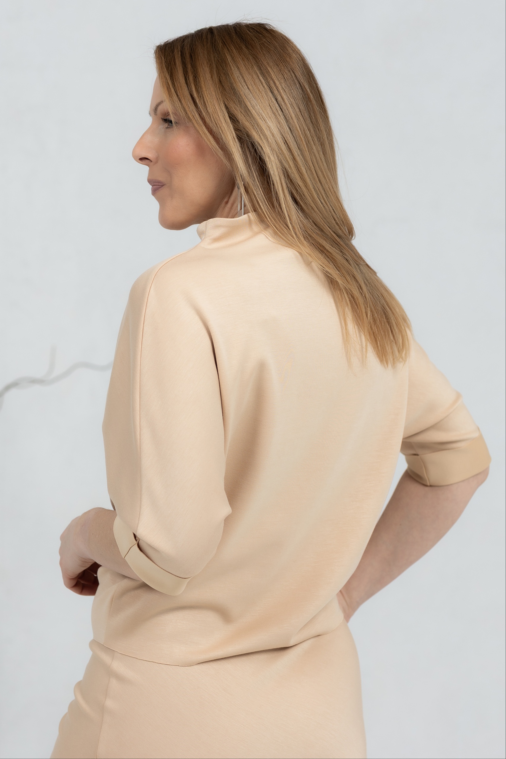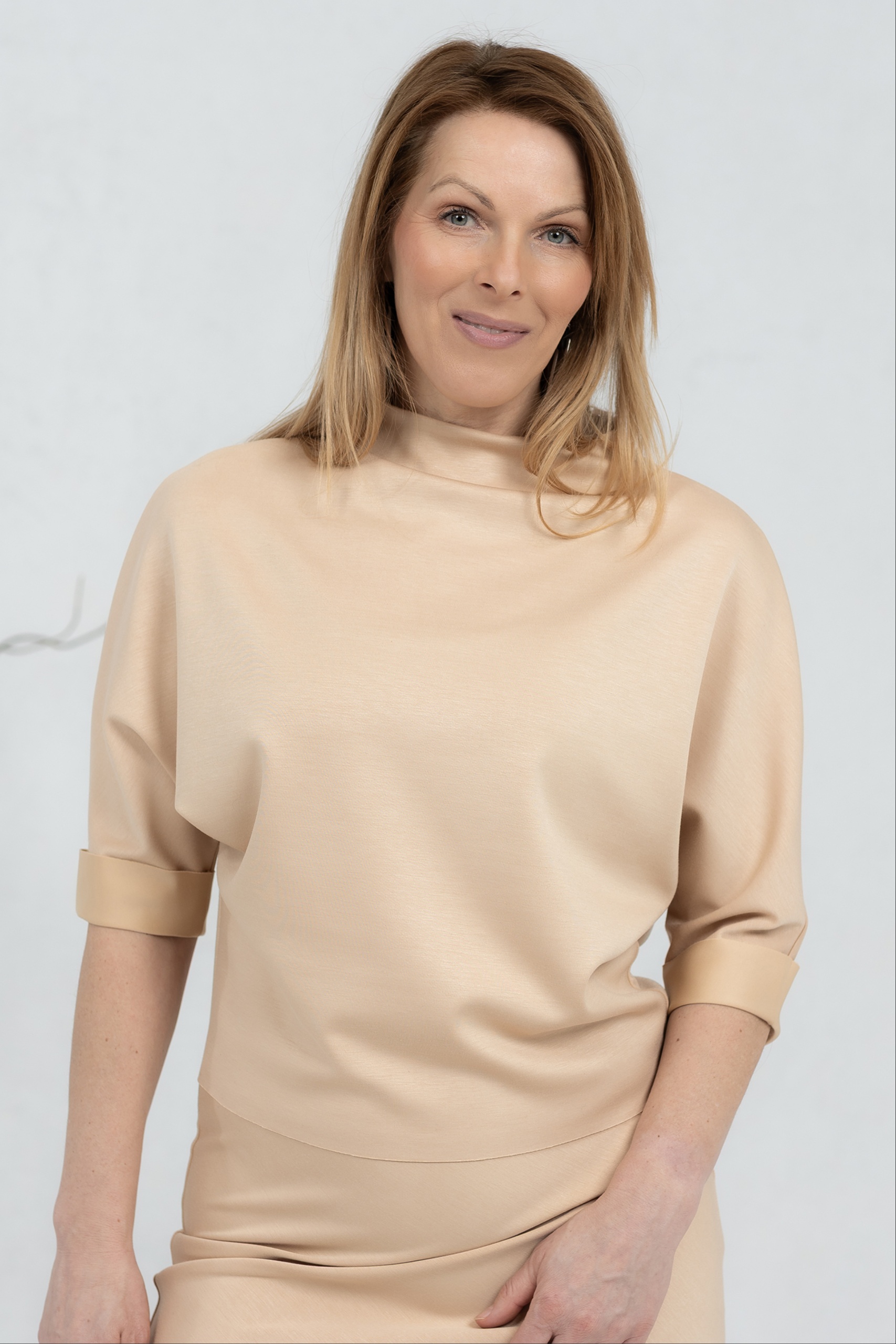 Kaori on modernse ja puhta joonega pluus, mis on valmistatud ülipehmest scuba-tüüpi viskooskangast, pakkudes kaunist vormi ja erakordset kandmismugavust. Kergelt V-lõikeline mudel ja minimalistlik kõrge kaelus loovad elegantse ning ajatu silueti. Poolpikad varrukad lisavad tasakaalu ja muudavad pluusi sobivaks nii tööpäevaks kui ka pidulikumaks hetkeks. Elastne ja vormi hoidev materjal järgib figuuri ning püsib kauni ja viimistletuna kogu päeva. Pluusi alläär ja varrukaotsad on töötlemata, luues nii moodsalt lihtsa ja stiilse välimuse.