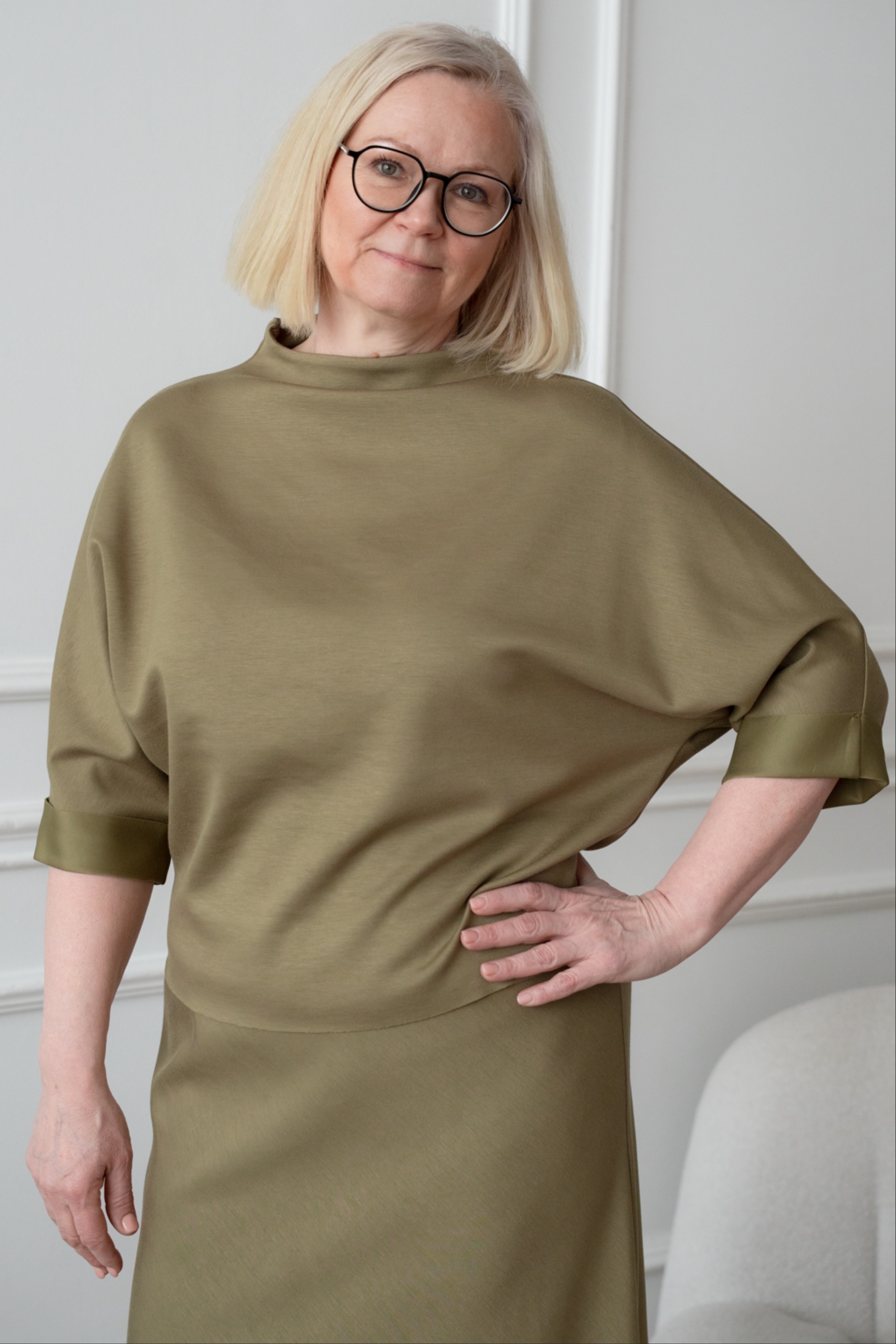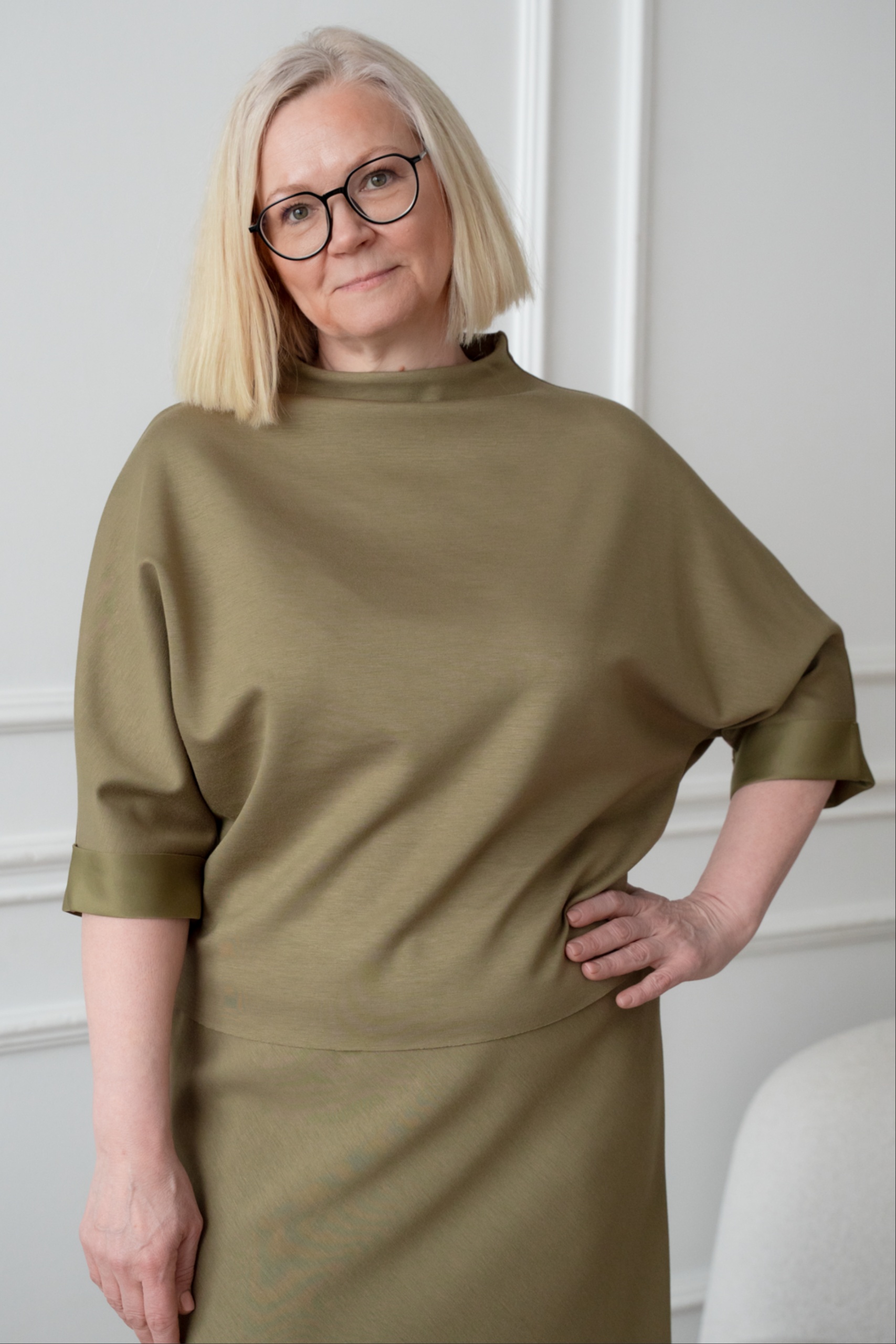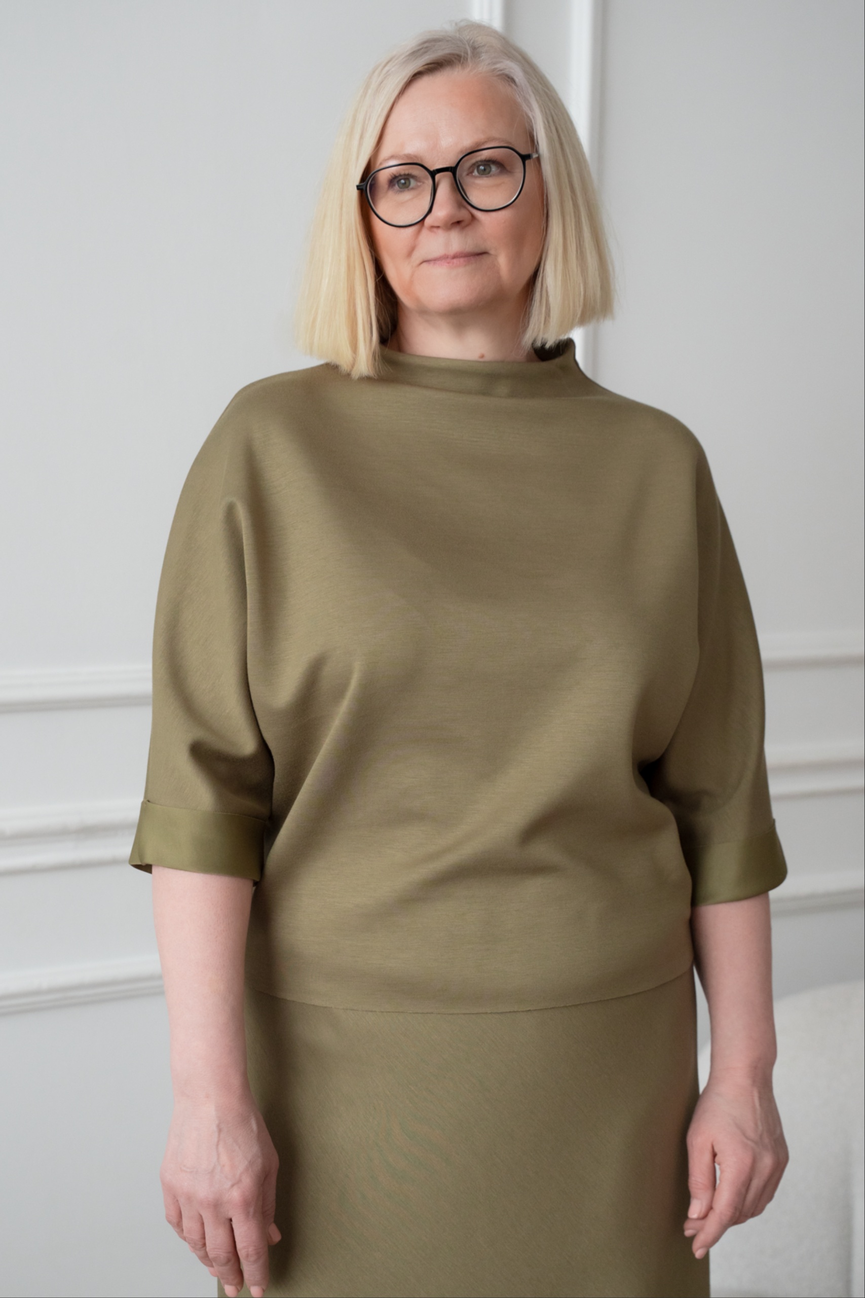 Kaori on modernse ja puhta joonega pluus, mis on valmistatud ülipehmest scuba-tüüpi viskooskangast, pakkudes kaunist vormi ja erakordset kandmismugavust. Kergelt V-lõikeline mudel ja minimalistlik kõrge kaelus loovad elegantse ning ajatu silueti. Poolpikad varrukad lisavad tasakaalu ja muudavad pluusi sobivaks nii tööpäevaks kui ka pidulikumaks hetkeks. Elastne ja vormi hoidev materjal järgib figuuri ning püsib kauni ja viimistletuna kogu päeva. Pluusi alläär ja varrukaotsad on töötlemata, luues nii moodsalt lihtsa ja stiilse välimuse.