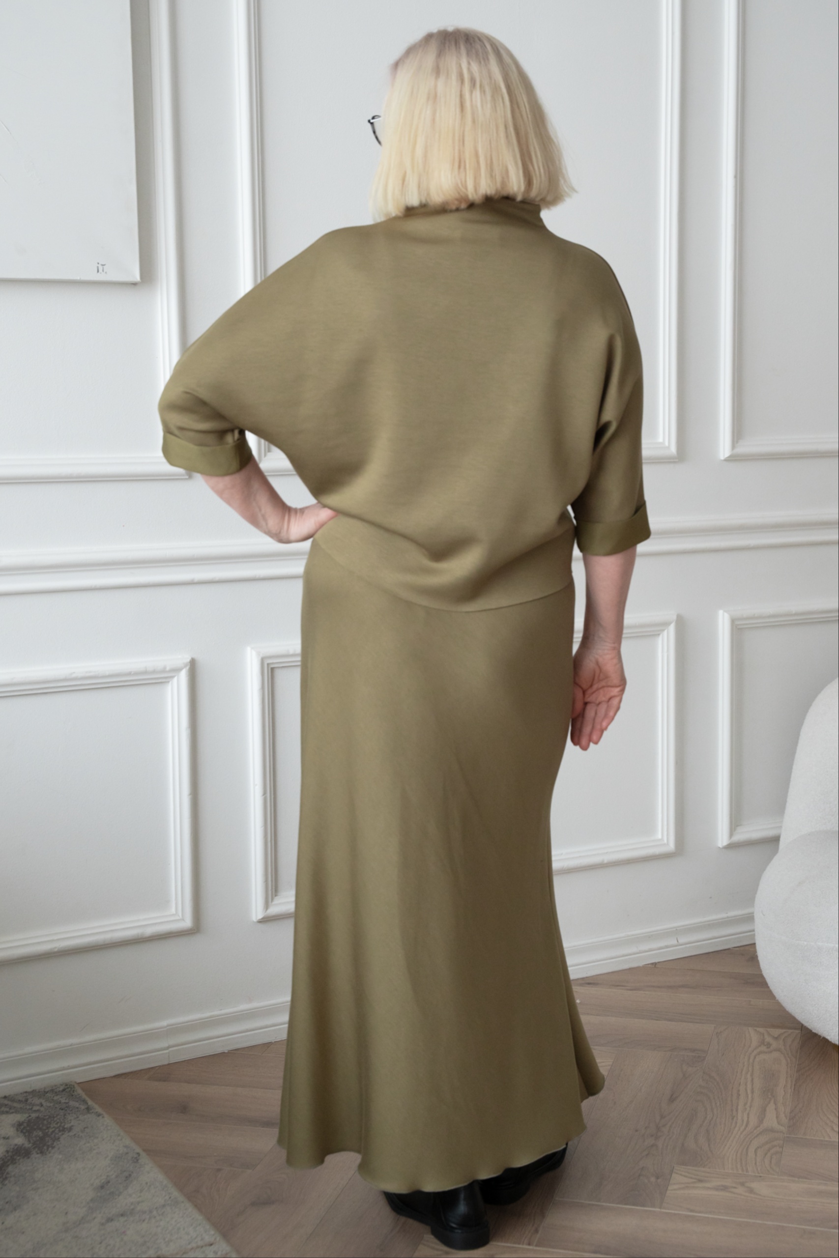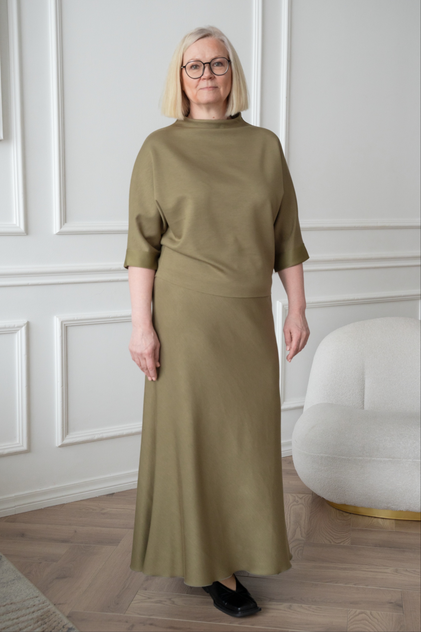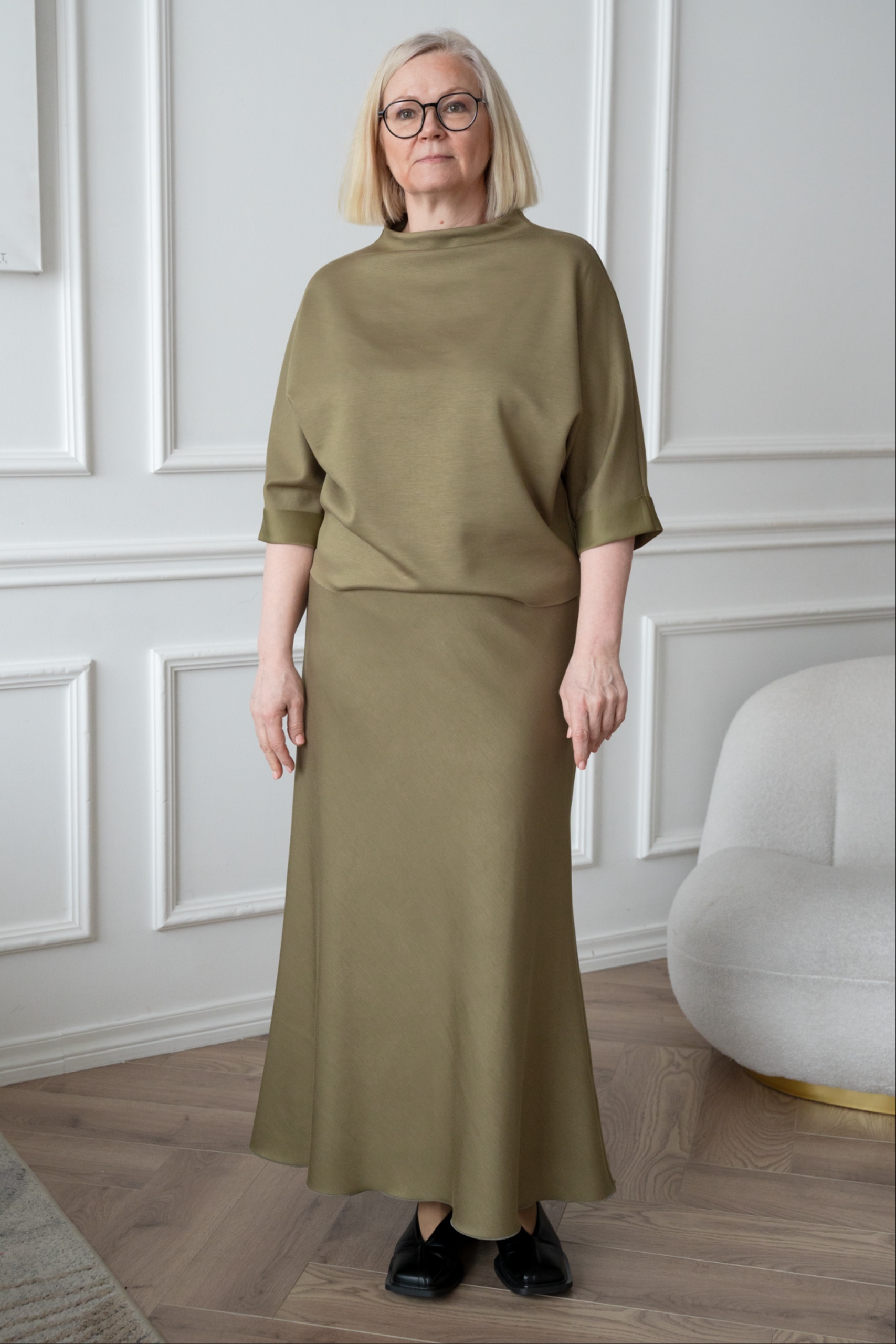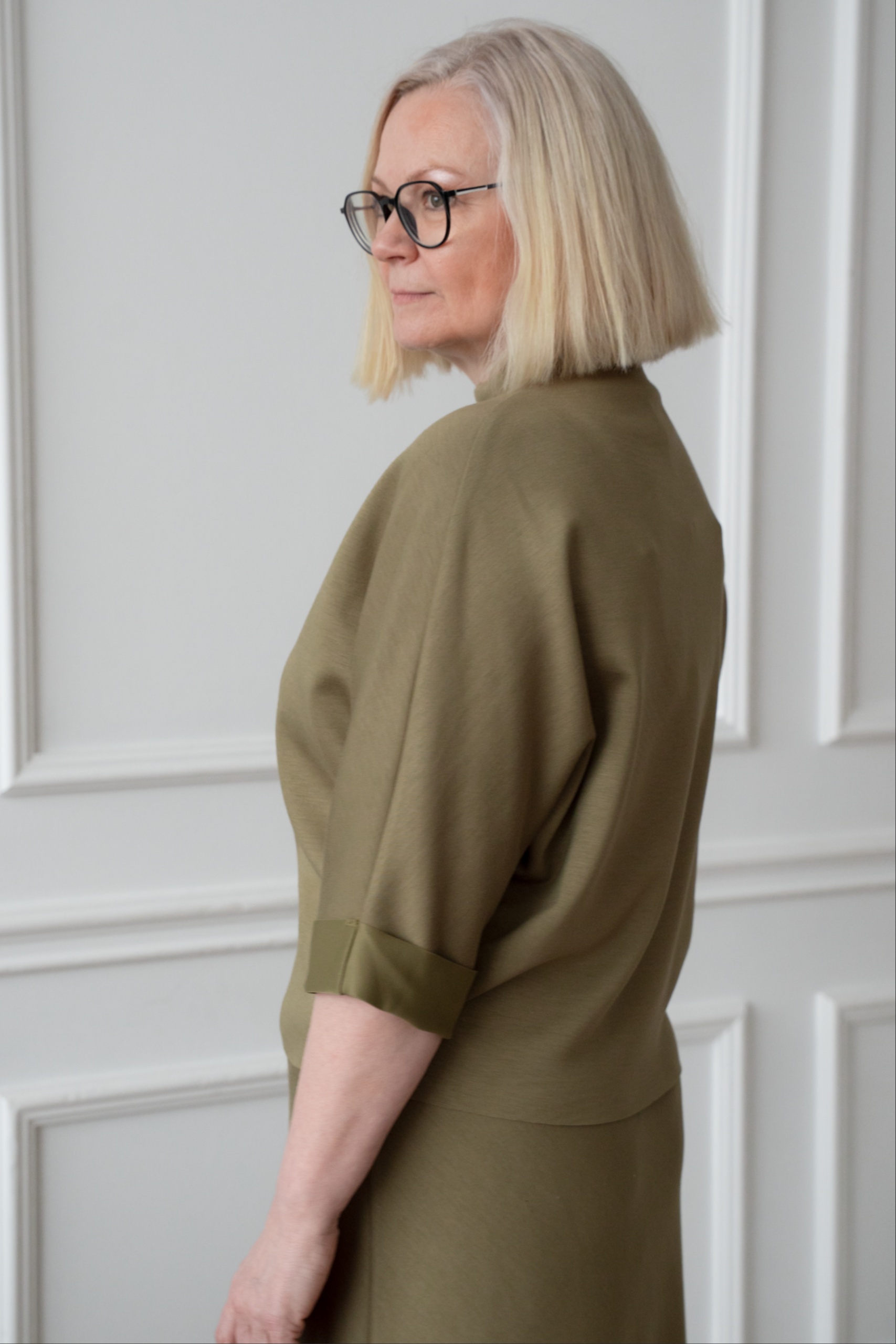 Kaori on modernse ja puhta joonega pluus, mis on valmistatud ülipehmest scuba-tüüpi viskooskangast, pakkudes kaunist vormi ja erakordset kandmismugavust. Kergelt V-lõikeline mudel ja minimalistlik kõrge kaelus loovad elegantse ning ajatu silueti. Poolpikad varrukad lisavad tasakaalu ja muudavad pluusi sobivaks nii tööpäevaks kui ka pidulikumaks hetkeks. Elastne ja vormi hoidev materjal järgib figuuri ning püsib kauni ja viimistletuna kogu päeva. Pluusi alläär ja varrukaotsad on töötlemata, luues nii moodsalt lihtsa ja stiilse välimuse.