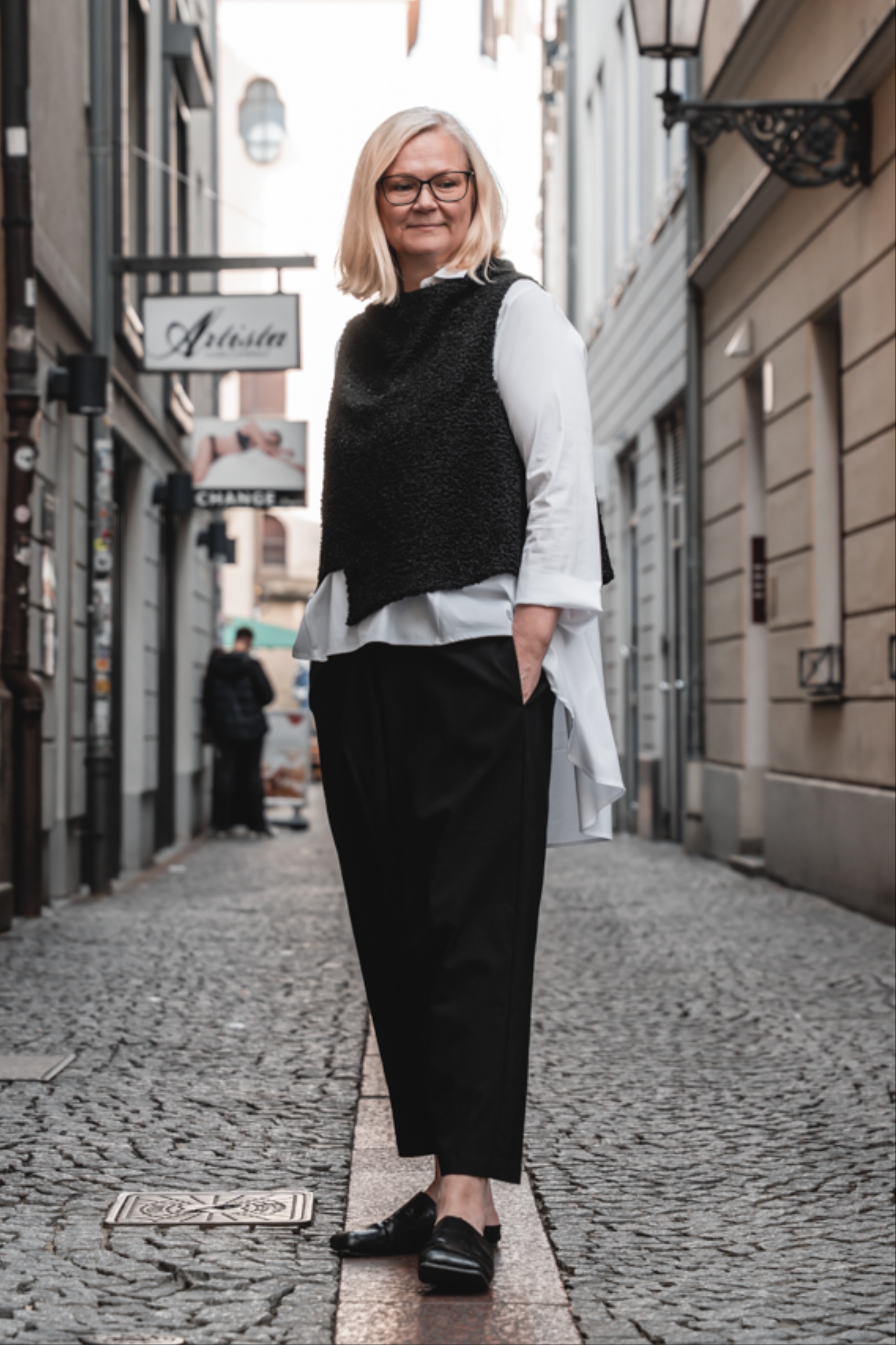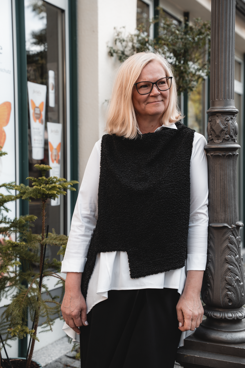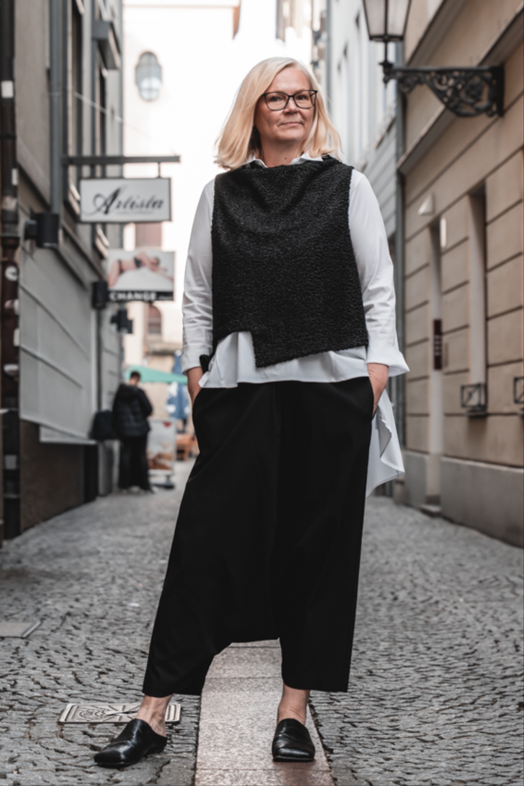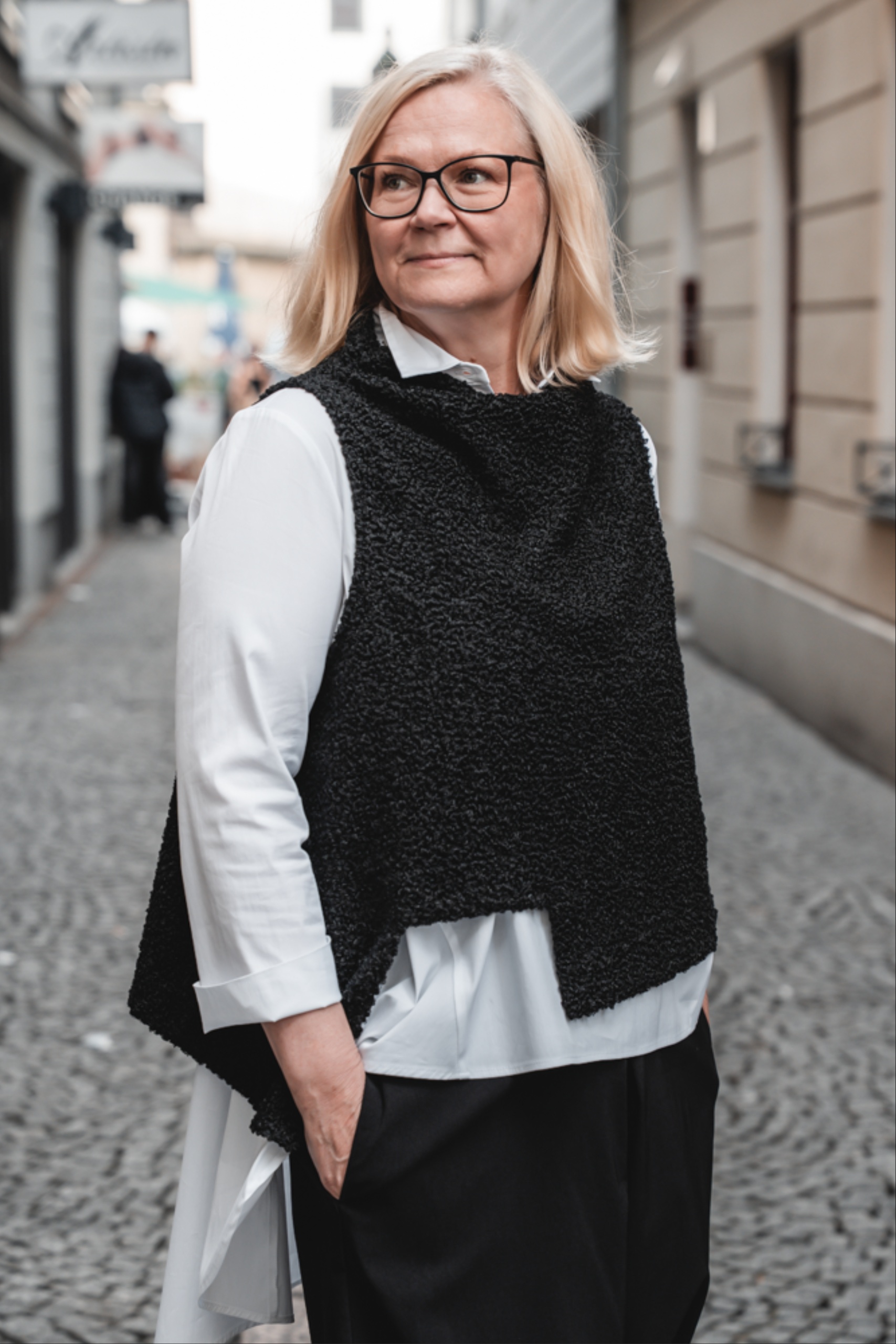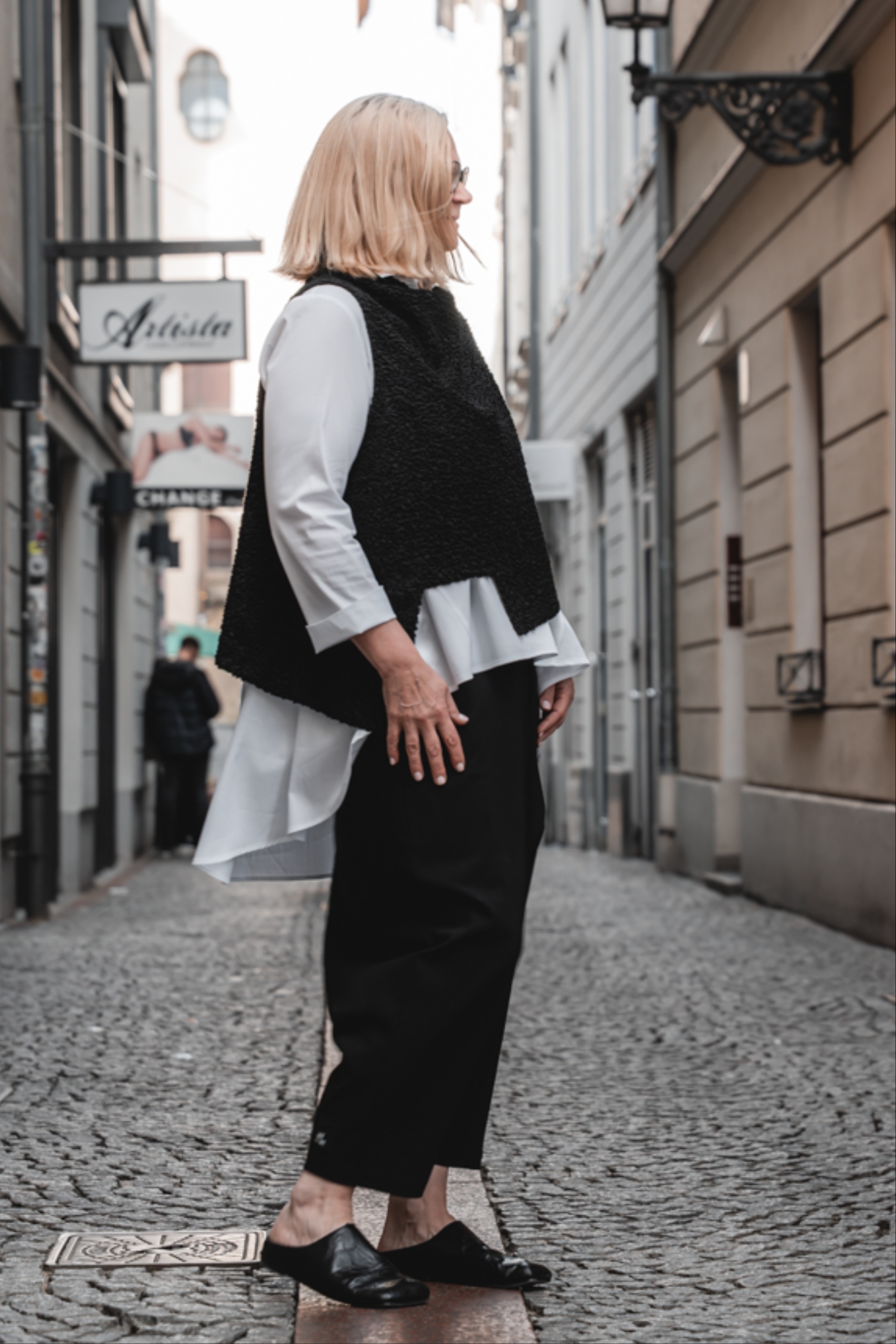 See must vest on modernne ja mitmekülgne lisand igapäevasesse garderoobi. Mõnus pehme ja karvane teddy kangas teeb sellest ideaalse talvise garderoobiosa. Kõrgem krae ja asümmeetriline alumine äär loovad dünaamilise silueti, mis lisab kihilisele riietusele karakterit. Vesti sirge lõige võimaldab seda kanda erinevate pluuside, kleitide või särkidega, pakkudes alati uue ja värske tulemuse. Materjal on meeldiv ja vastupidav, tagades rõivale vormi säilimise. See on täiuslik valik neile, kes hindavad stiili ja mugavuse tasakaalu.
