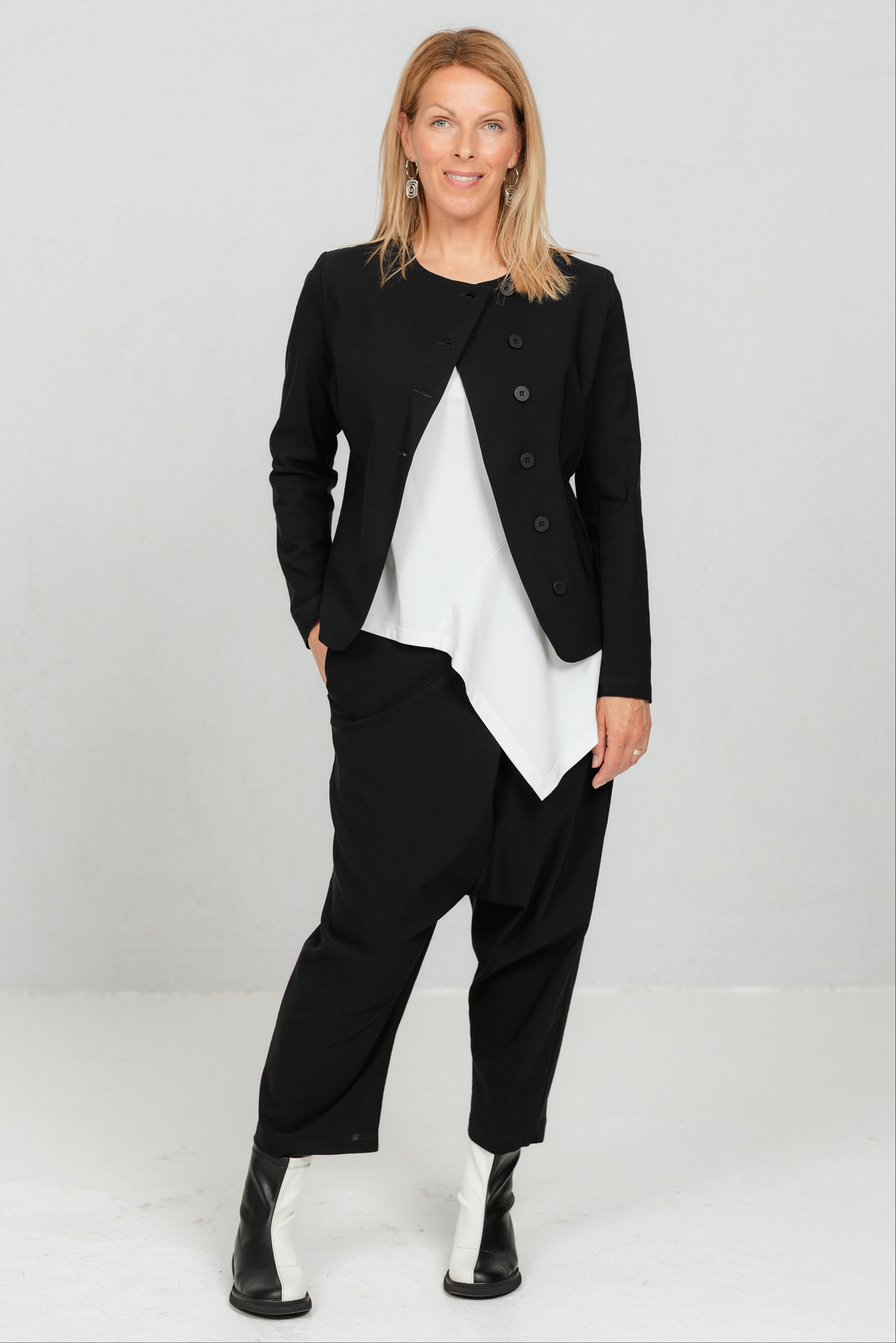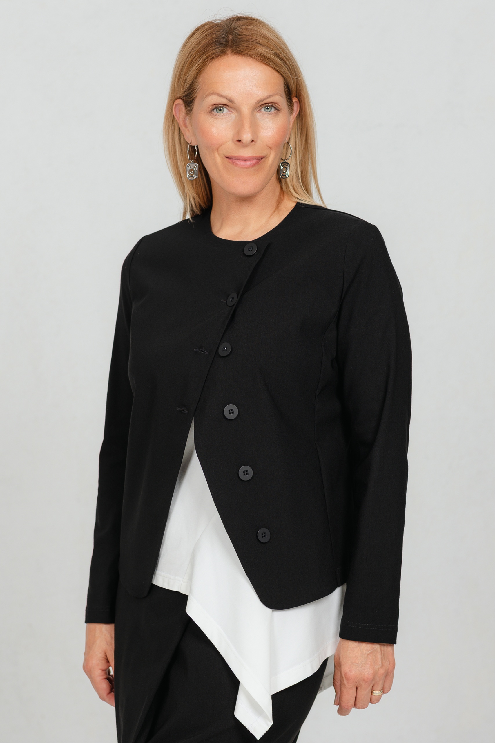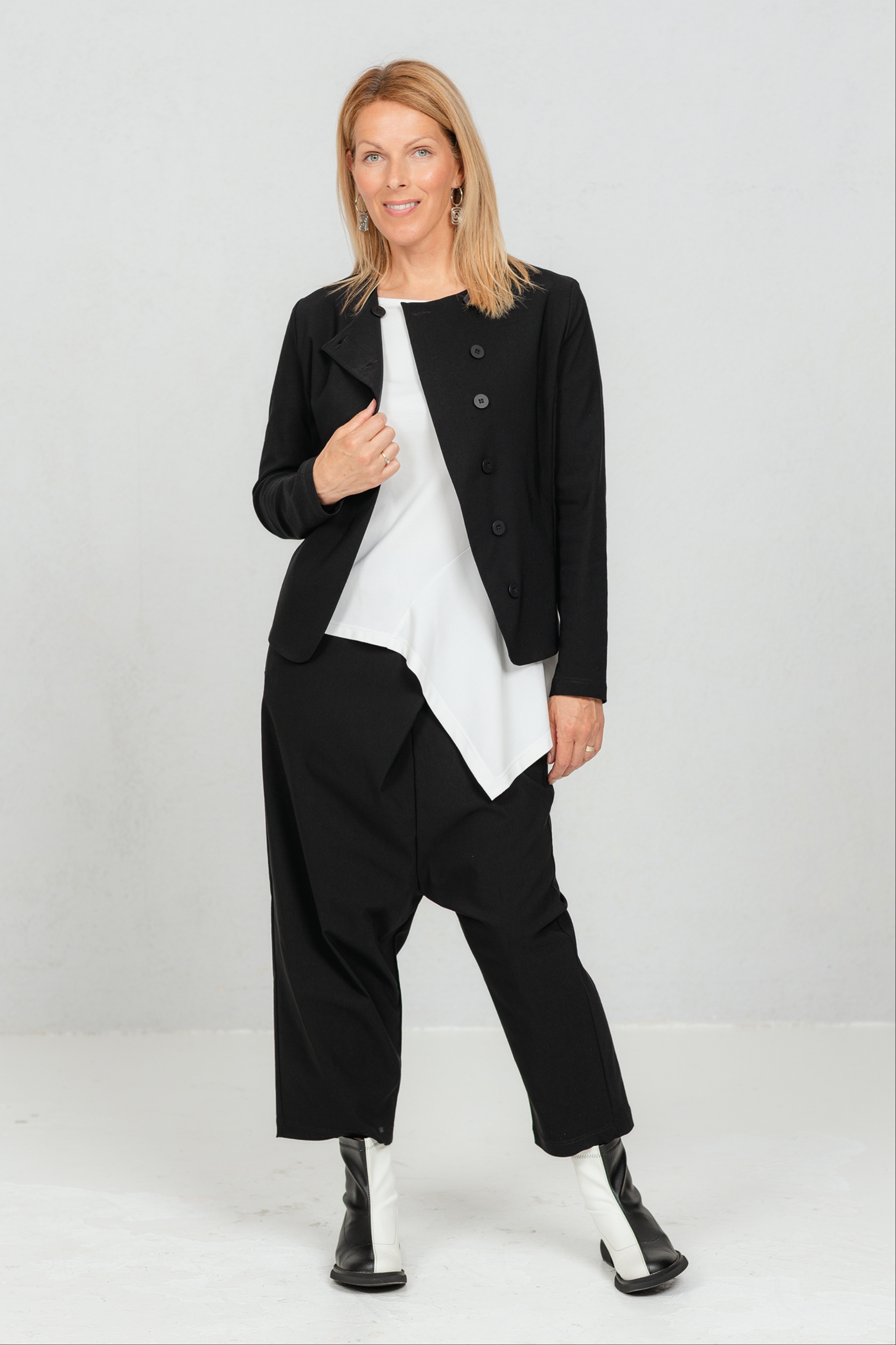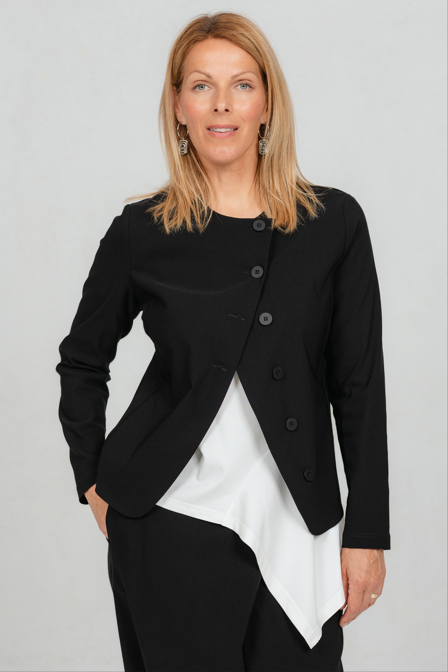 Minimalistliku lõike ja asümmeetrilise eest kinnitusega Fukumu jakk on loodud neile, kes hindavad selget joont ja mugavust. Ilma voodrita jakk on kerge ja mugav, sobides suurepäraselt nii sees kui väljas kandmiseks. Ümar kaelus ja kergelt kaarjas nööpidega esikinnis annavad jakile eripärase ilme. Must toon teeb sellest lihtsasti kombineeritava eseme, mis täiendab nii igapäevast kui ka pidulikumat riietust.