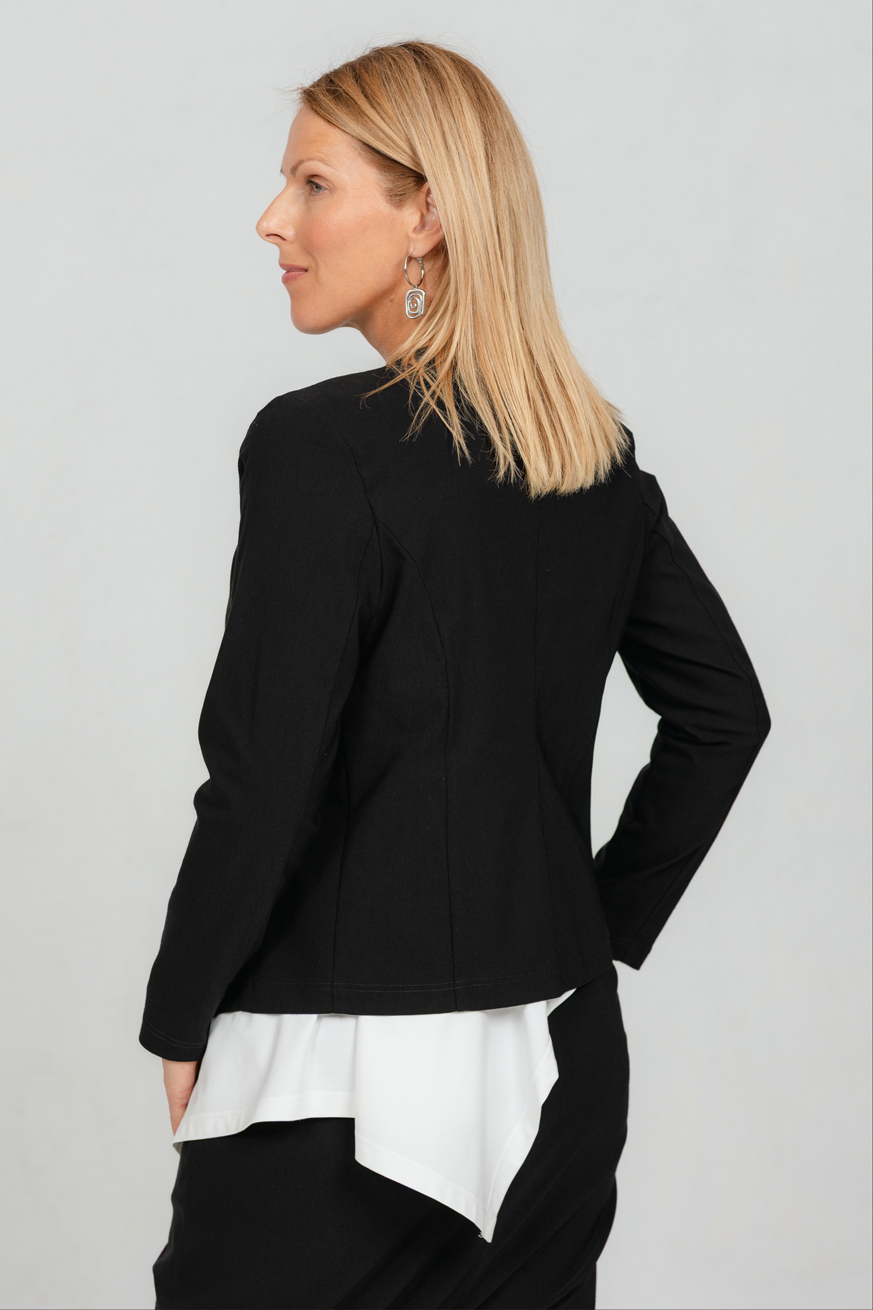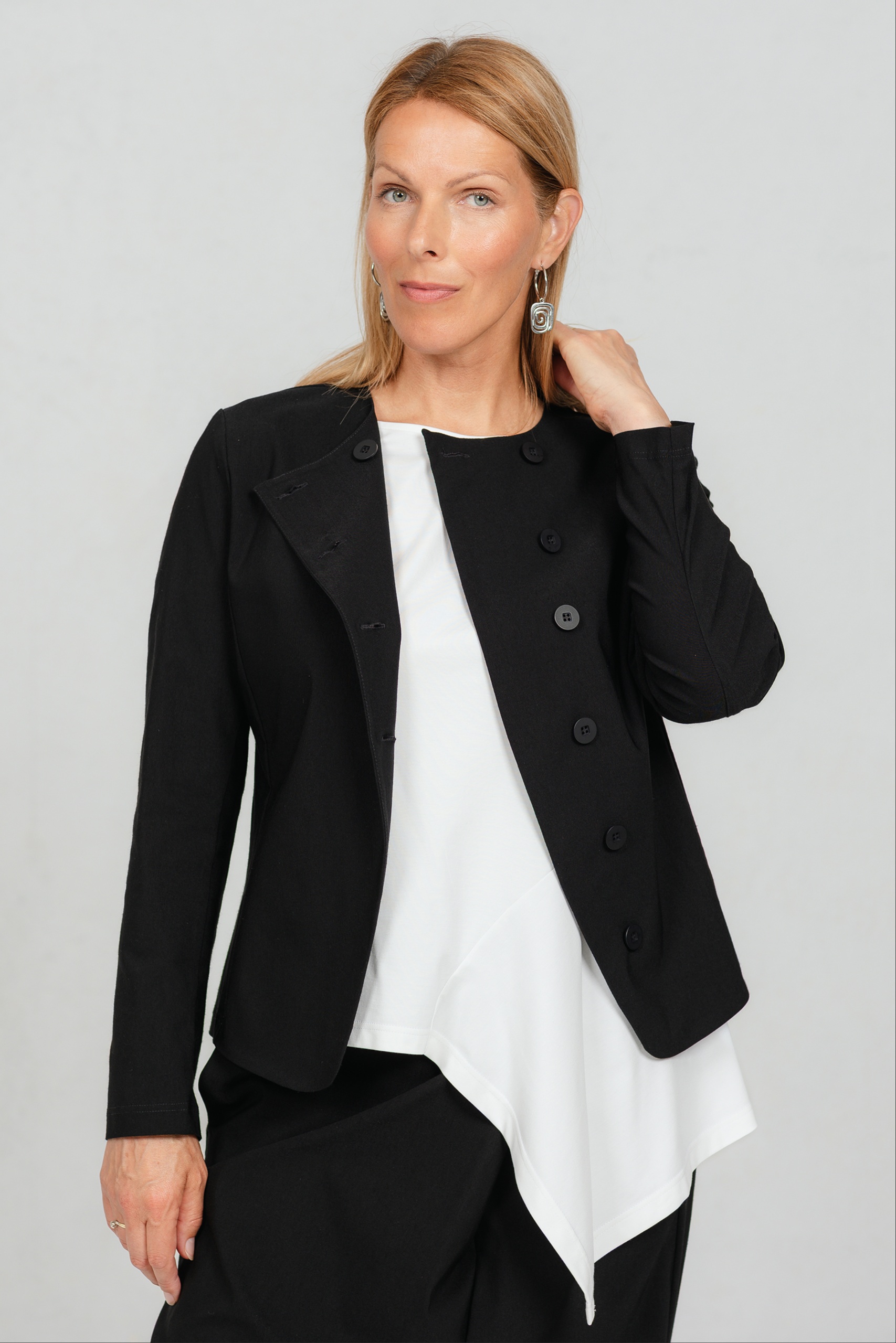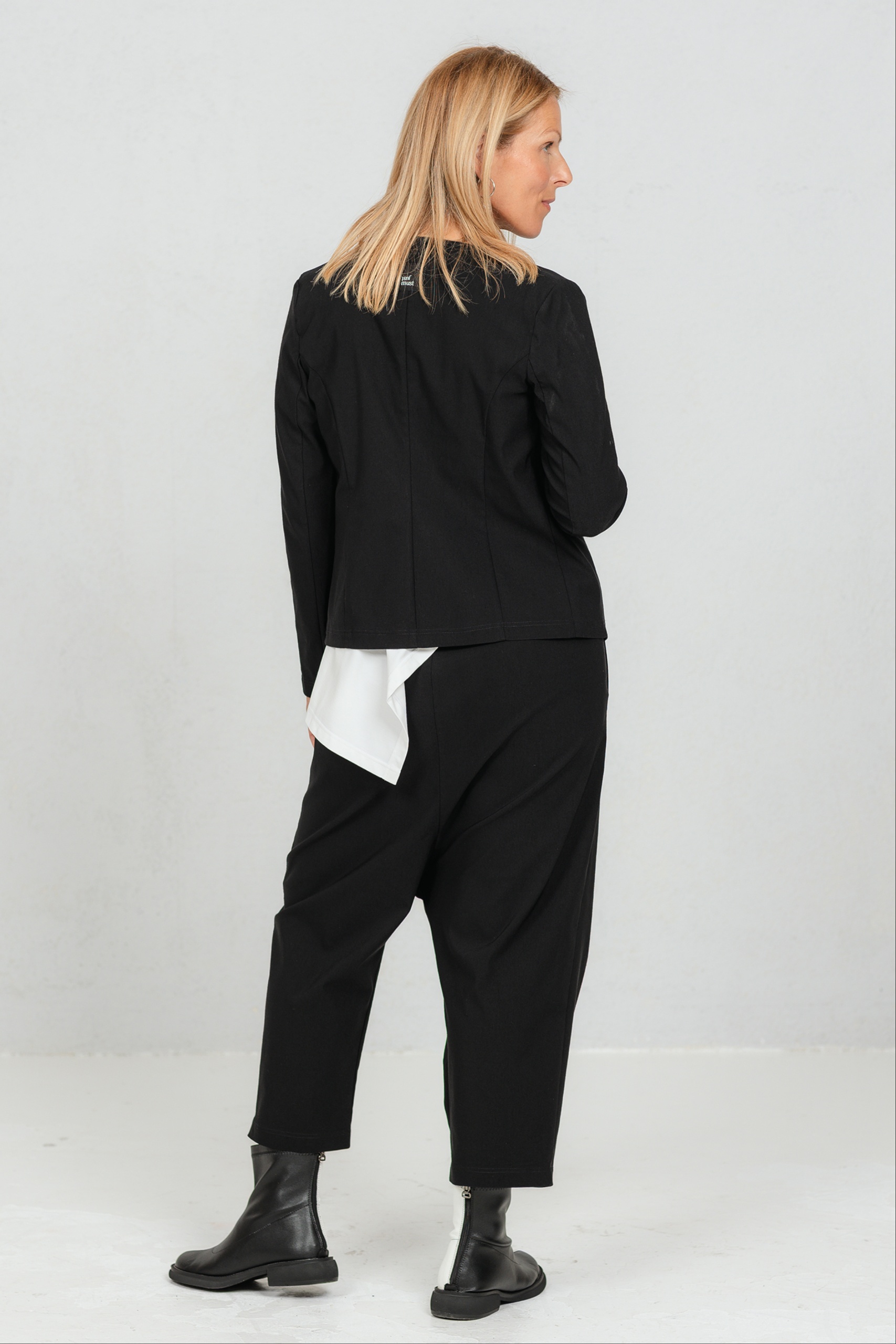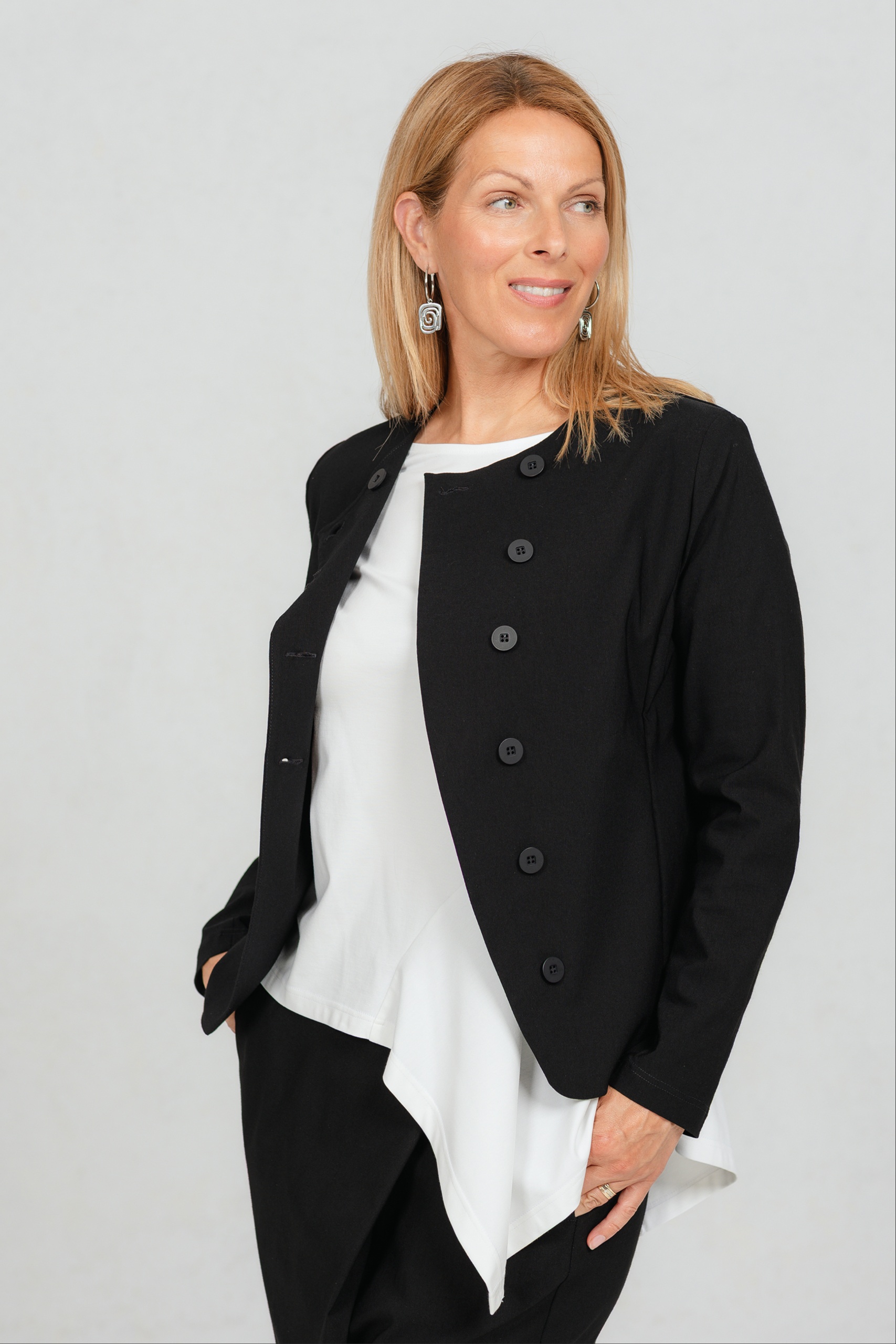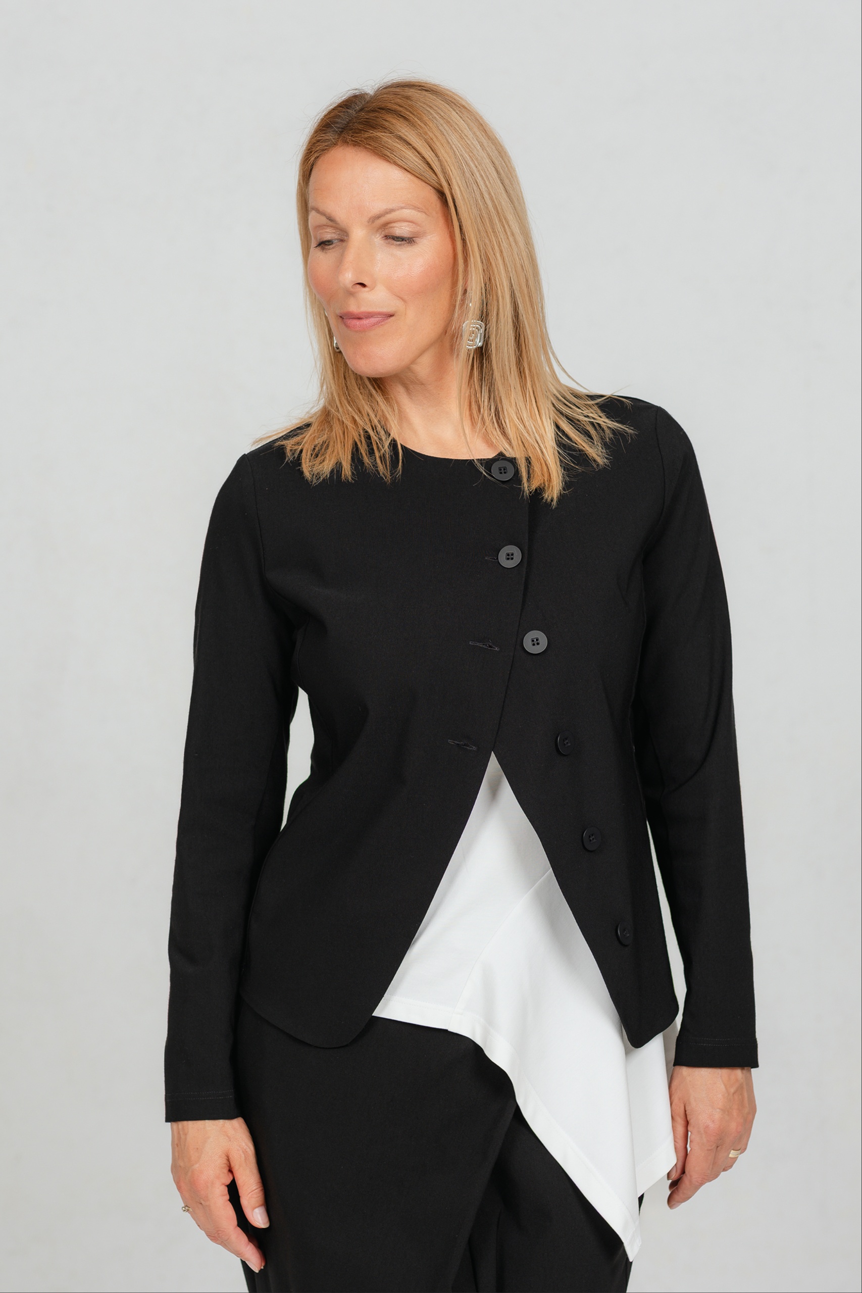 Minimalistliku lõike ja asümmeetrilise eest kinnitusega Fukumu jakk on loodud neile, kes hindavad selget joont ja mugavust. Ilma voodrita jakk on kerge ja mugav, sobides suurepäraselt nii sees kui väljas kandmiseks. Ümar kaelus ja kergelt kaarjas nööpidega esikinnis annavad jakile eripärase ilme. Must toon teeb sellest lihtsasti kombineeritava eseme, mis täiendab nii igapäevast kui ka pidulikumat riietust.