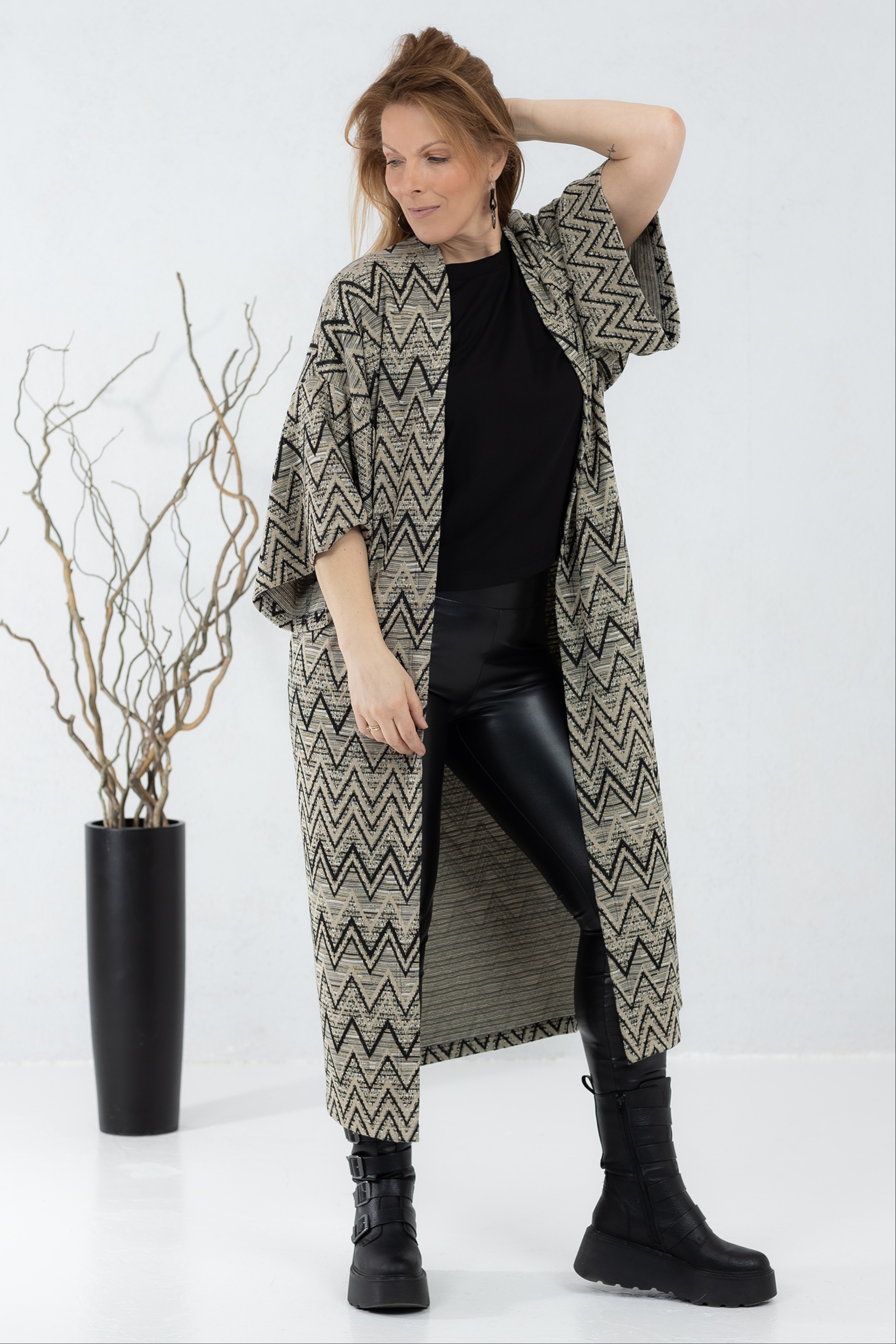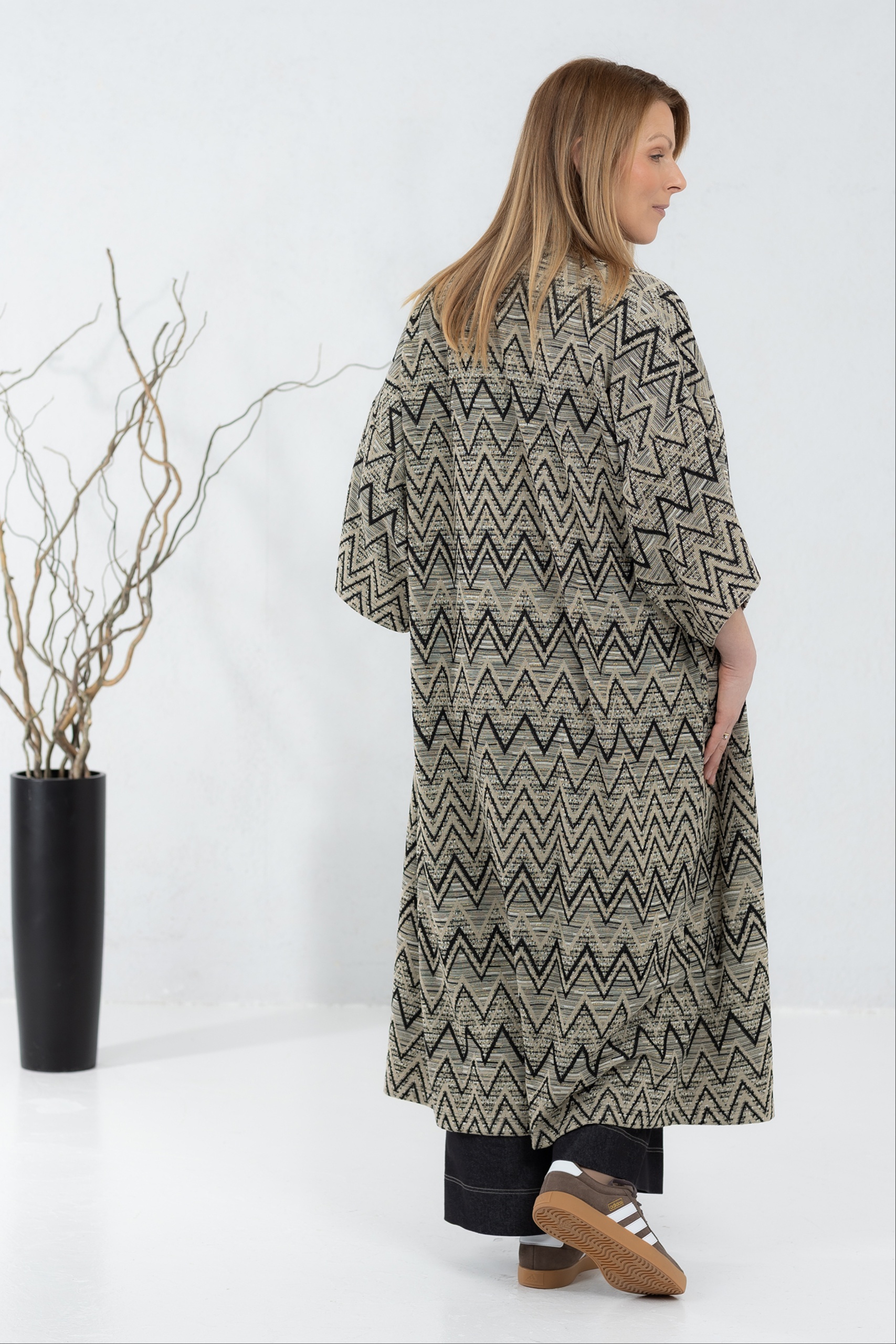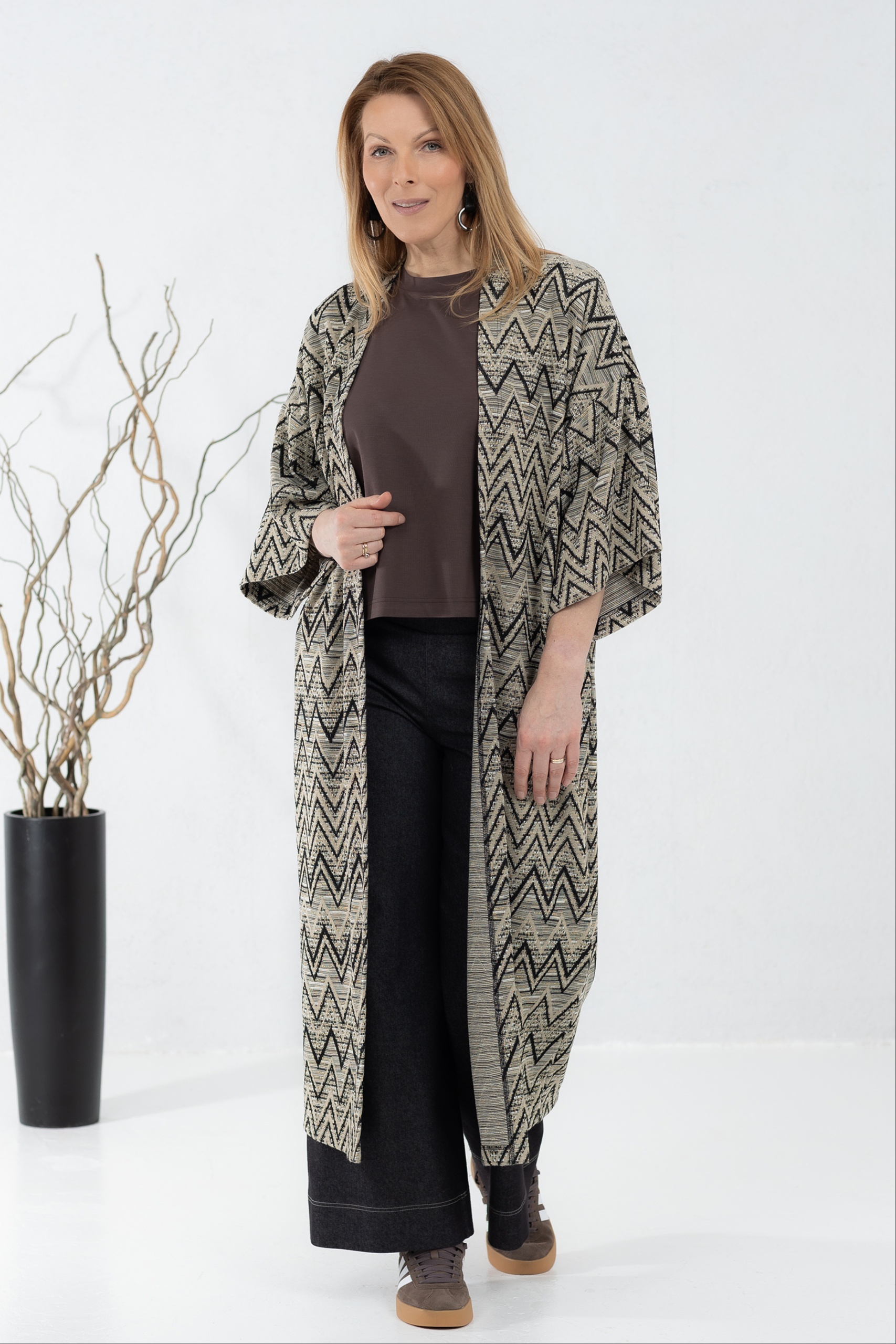 Kergest kudumkangast kimonojakk. Silmapaistva kergelt boho stiilis mustriga jakk on mõnus asendus kampsunile või klassikalisele kimonole. Jakil on avatud lõige ja laiad varrukad, mis teevad selle kandmise eriti mugavaks. Kanna koos kleidi või pükstega – efektne garderoobi täiendus on kindlasti tagatud.