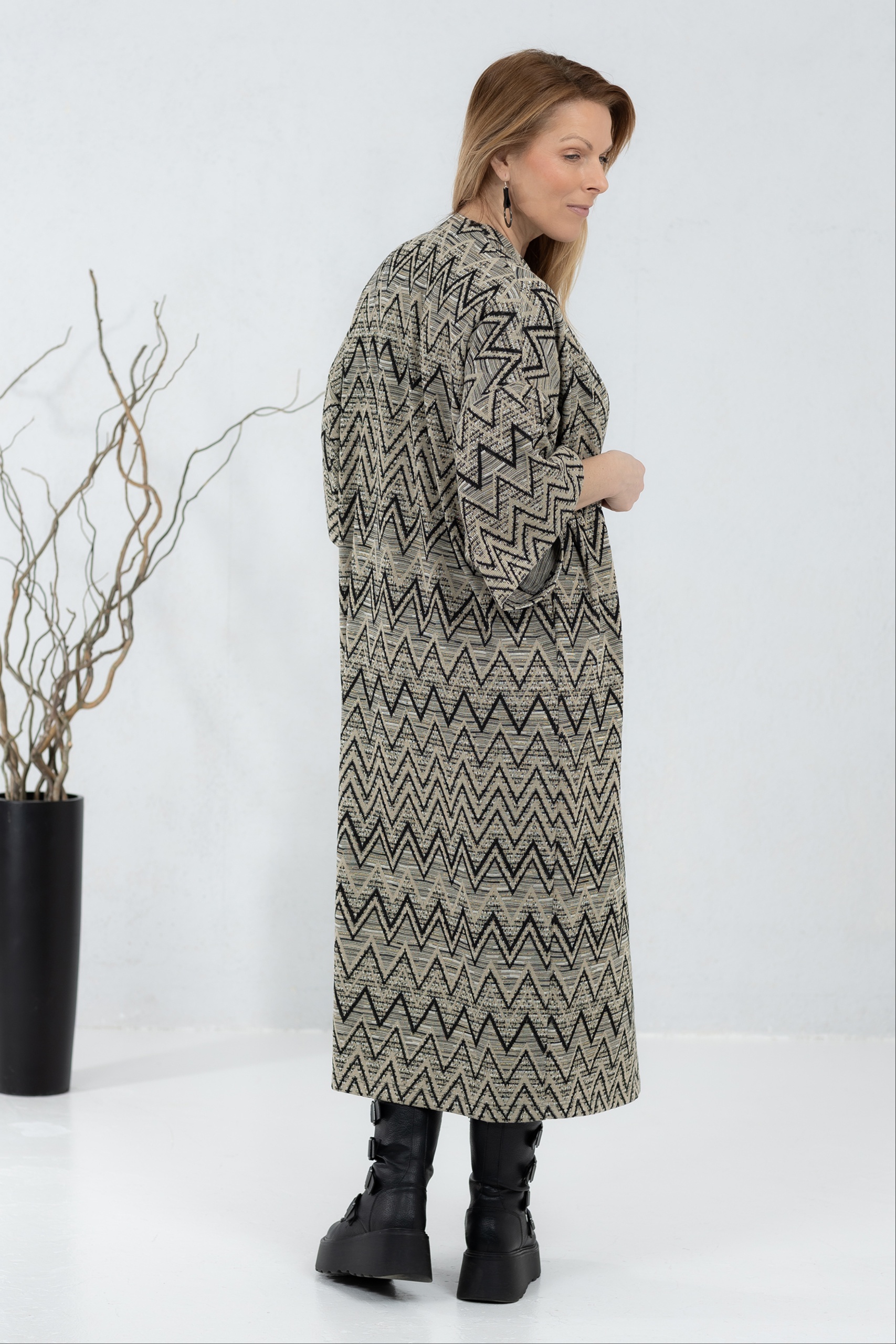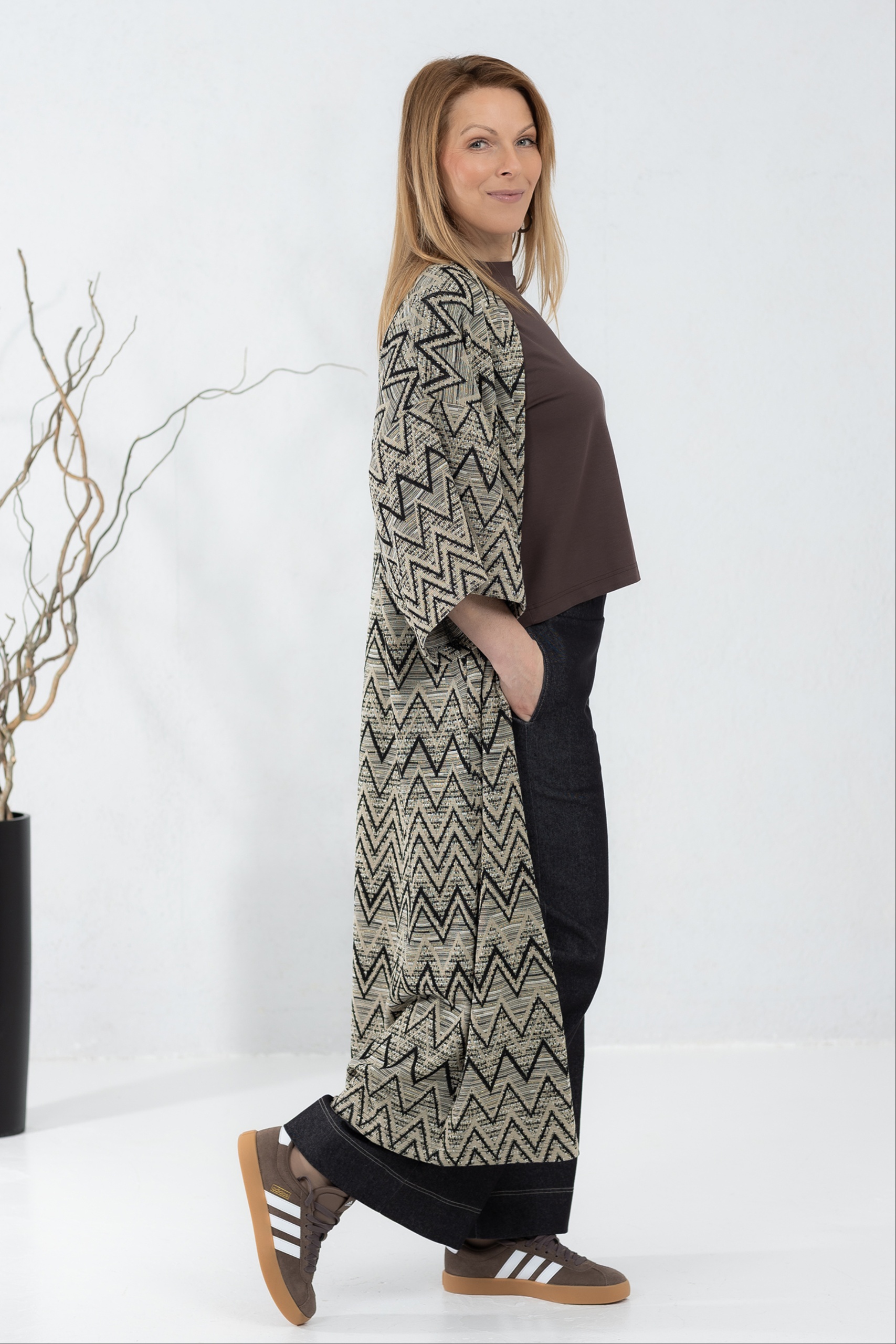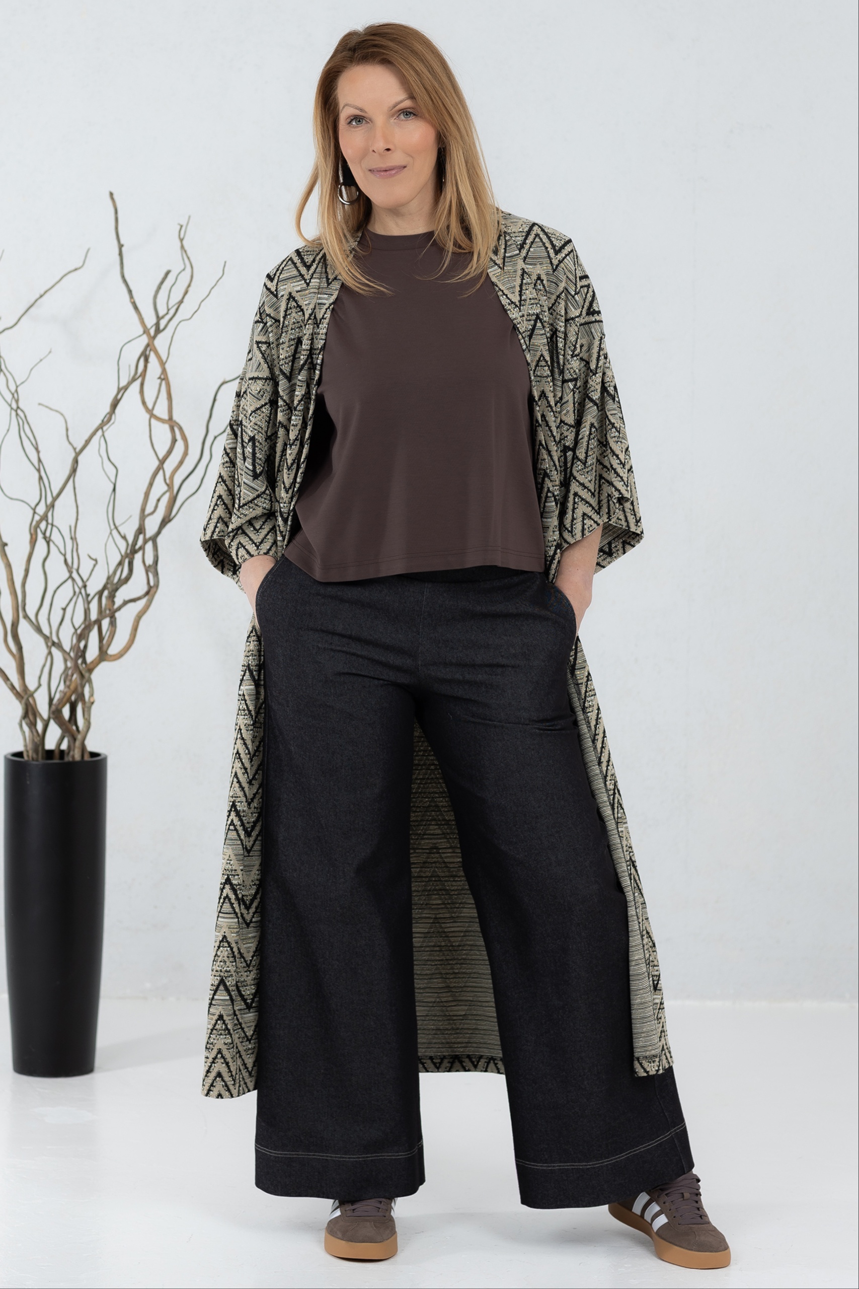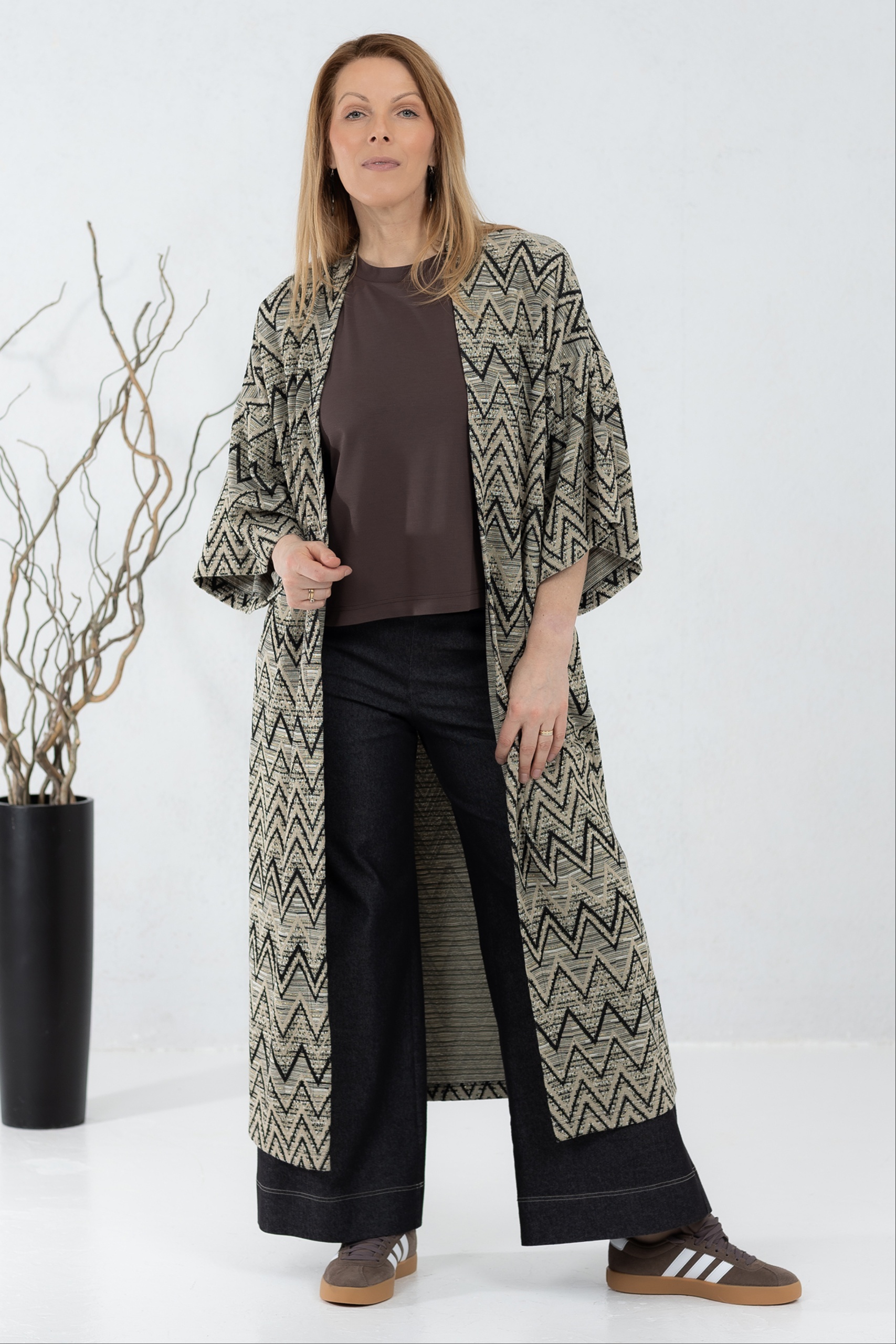 Kergest kudumkangast kimonojakk. Silmapaistva kergelt boho stiilis mustriga jakk on mõnus asendus kampsunile või klassikalisele kimonole. Jakil on avatud lõige ja laiad varrukad, mis teevad selle kandmise eriti mugavaks. Kanna koos kleidi või pükstega – efektne garderoobi täiendus on kindlasti tagatud.
