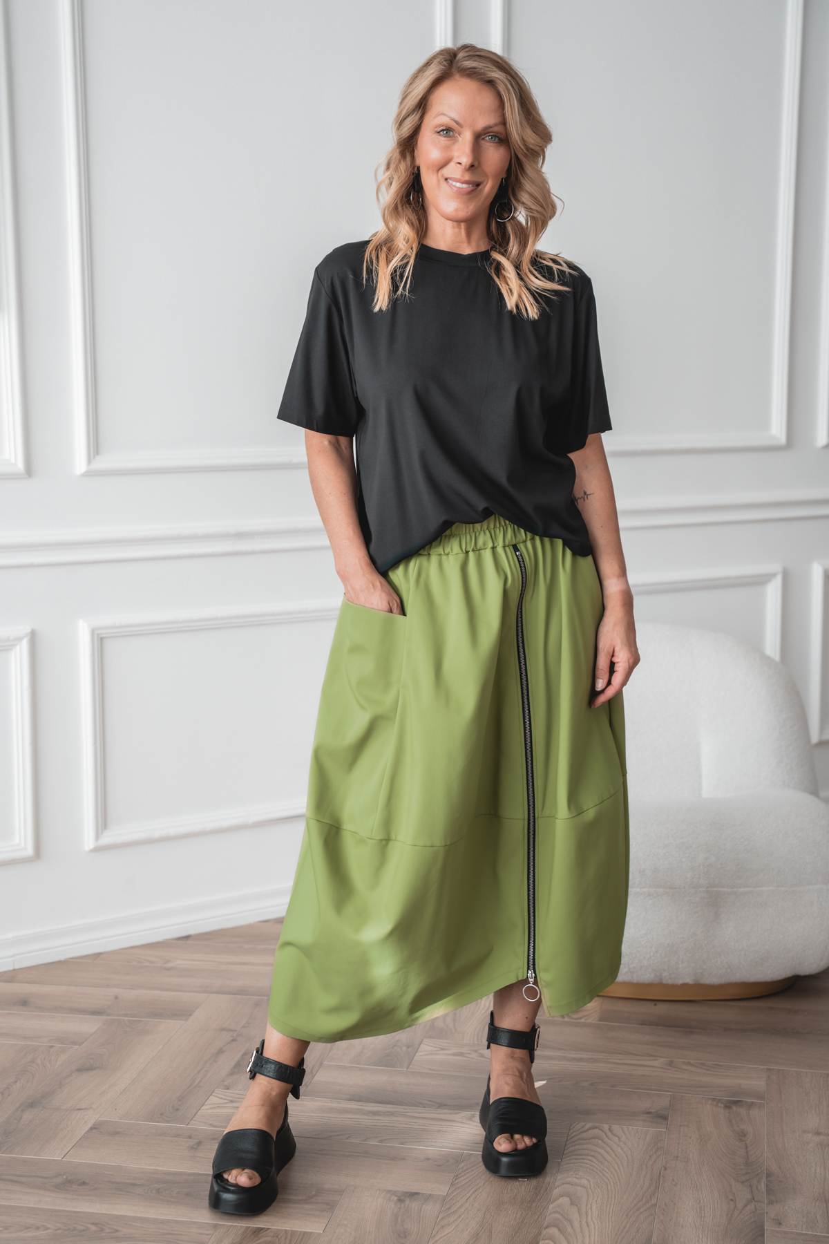 See midiseelik on kaasaegne ja praktiline valik. Avar ja kergelt asümmeetriline lõige loob huvitava silueti, mida täiendab pikk esilukk – detail, mis lisab nii funktsionaalsust kui ka julget karakterit. Elastne värvel tagab mugava istuvuse ja vaba liikumise, samas kui sügavad taskud muudavad seeliku igapäevaselt praktiliseks. Kerge, kuid vastupidav kangas langeb kaunilt ja sobib kanda nii tööl, vabal ajal kui ka pidulikematel hetkedel. Lihtsasti kombineeritav – lisa juurde minimalistlik topp või vastukaaluks efektne jakk.