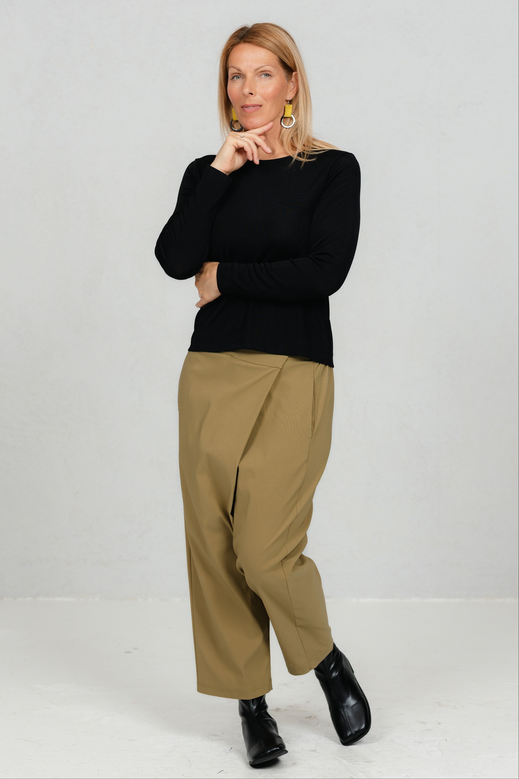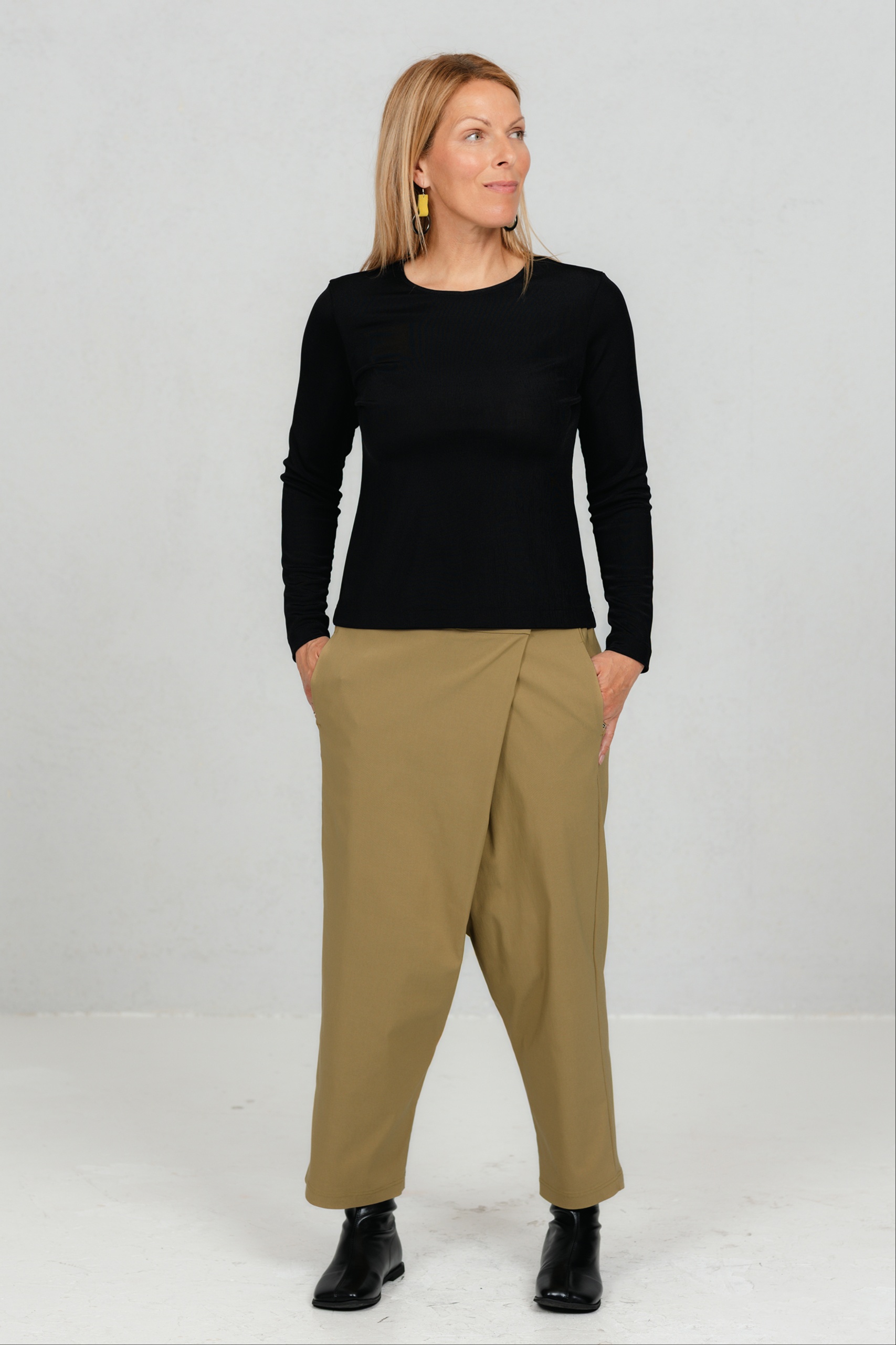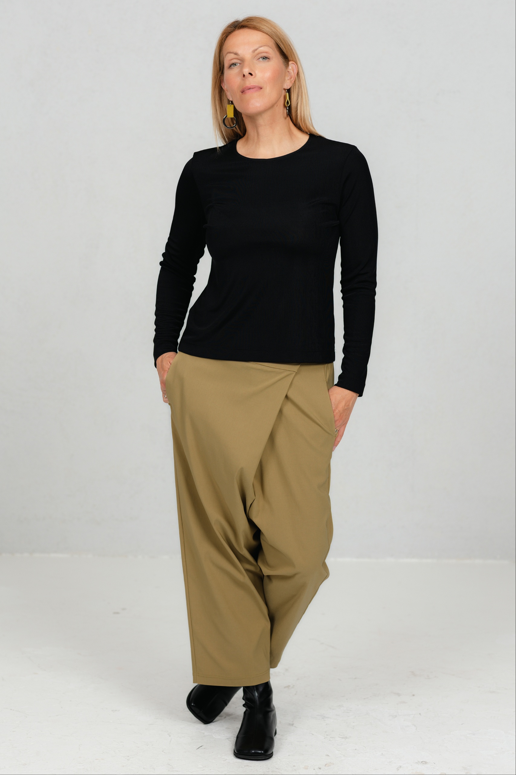 Need minimalistlikud mustad püksid ühendavad mugavuse ja ajatu stiili. Asümmeetriline ülekäiguga esidetail annab neile iseloomu ja eristab neid klassikalistest sirge lõikega pükstest. Veidi avaram lõige loob vaba liikumise ja modernse silueti. Need püksid on mitmekülgne valik nii kontorisse kui igapäevaseks kandmiseks – kanna neid elegantse jaki või vabamas stiilis pluusiga ning loo alati stiilne ja enesekindel välimus.