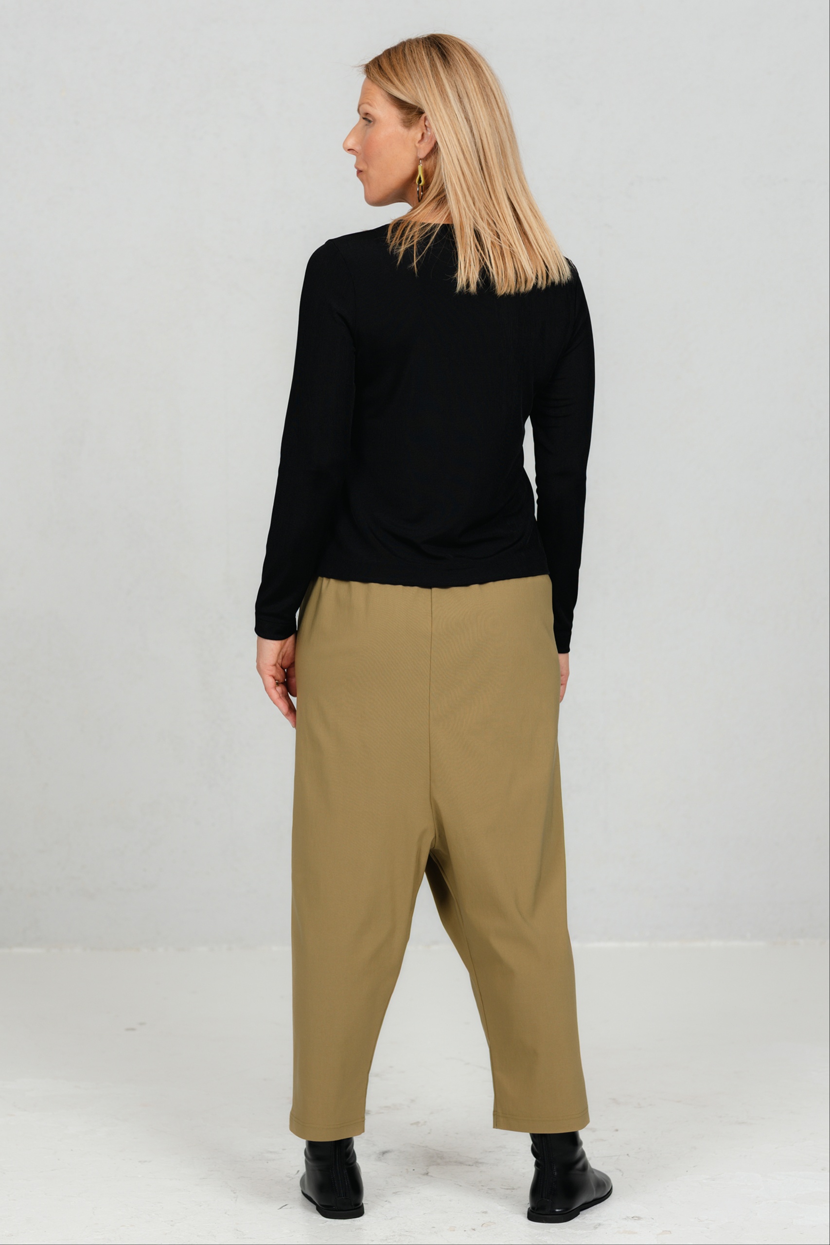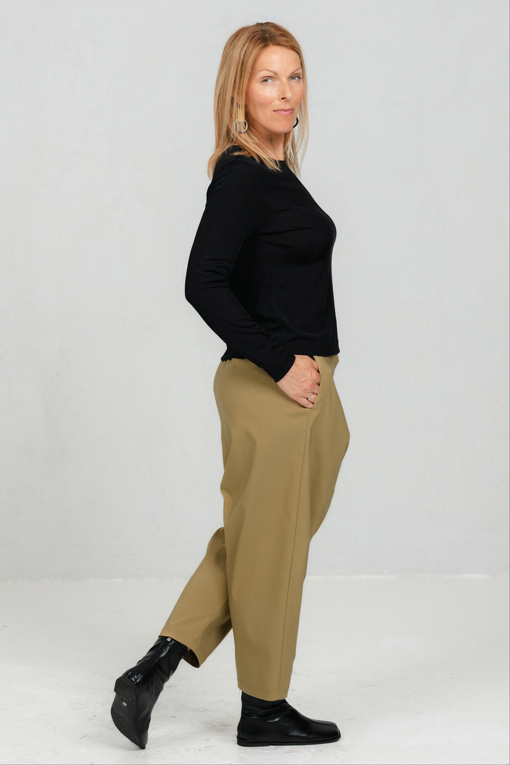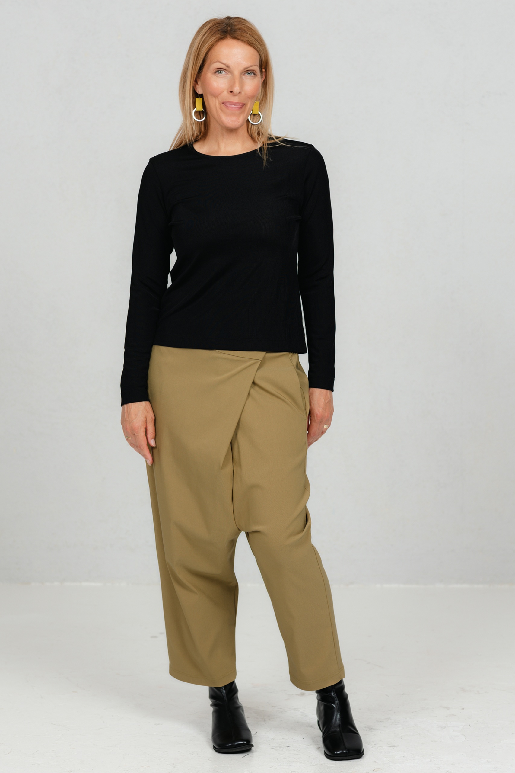 Need minimalistlikud mustad püksid ühendavad mugavuse ja ajatu stiili. Asümmeetriline ülekäiguga esidetail annab neile iseloomu ja eristab neid klassikalistest sirge lõikega pükstest. Veidi avaram lõige loob vaba liikumise ja modernse silueti. Need püksid on mitmekülgne valik nii kontorisse kui igapäevaseks kandmiseks – kanna neid elegantse jaki või vabamas stiilis pluusiga ning loo alati stiilne ja enesekindel välimus.